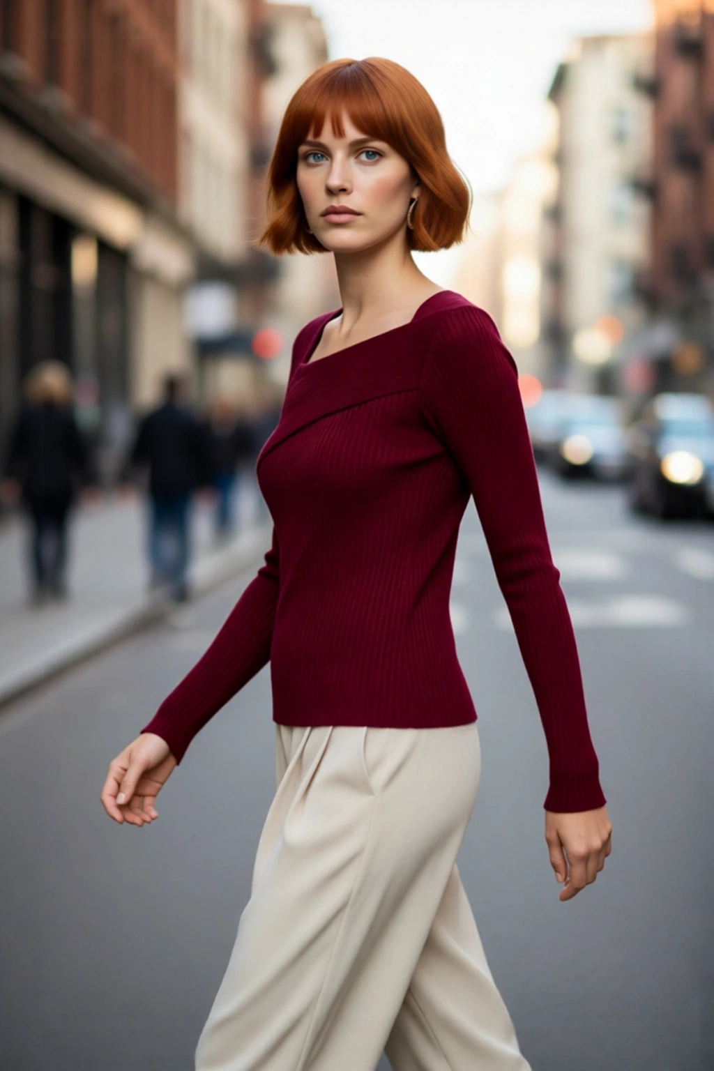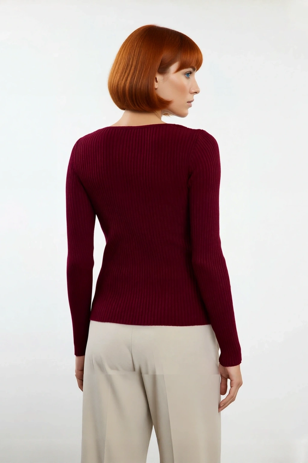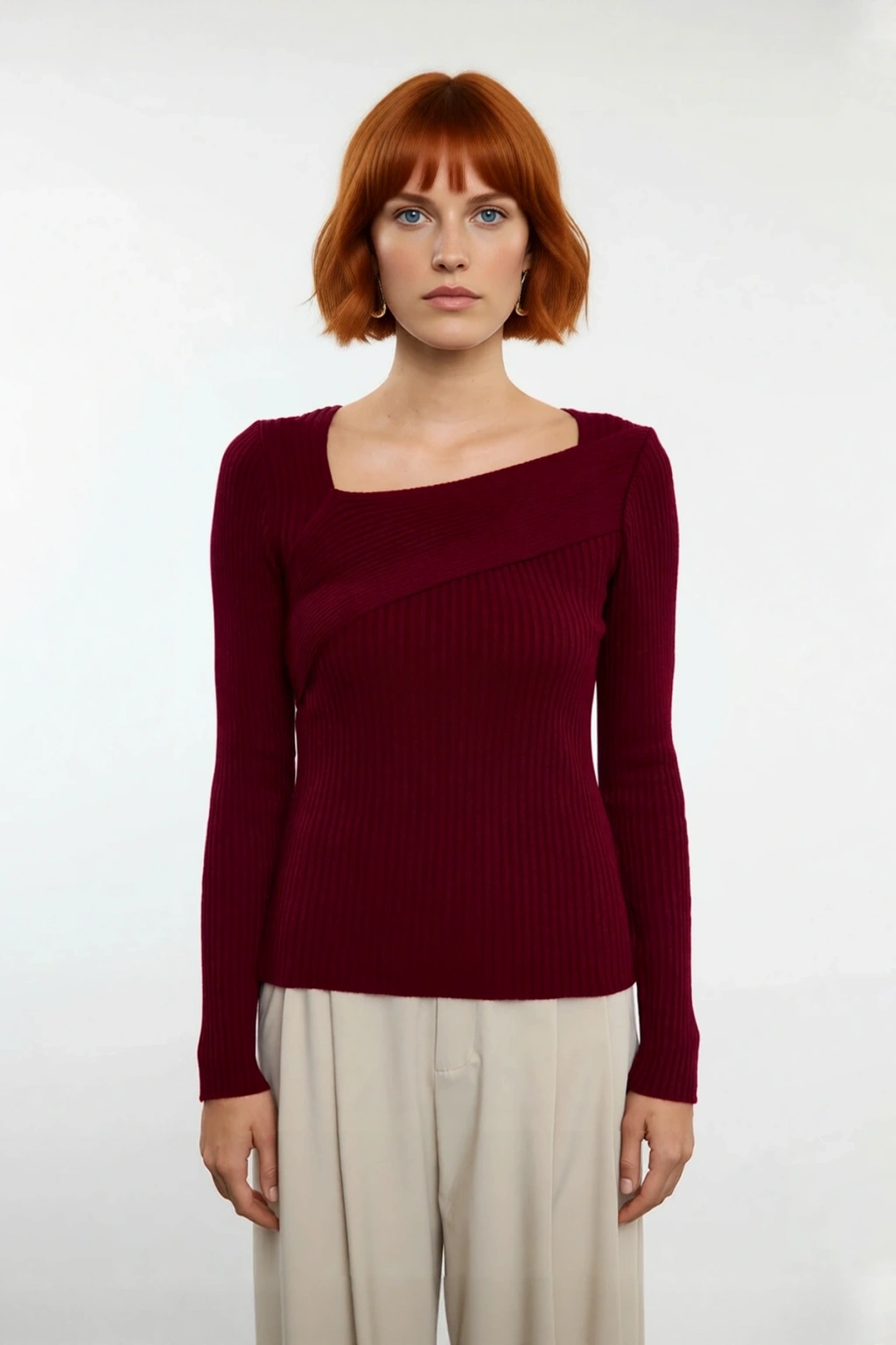 Ürün Özellikleri: Fitted kalıp, akrilik materyal, düz desen, asimetrik yaka, standart kol, triko kumaş, bordo renk, baskısız tasarım.