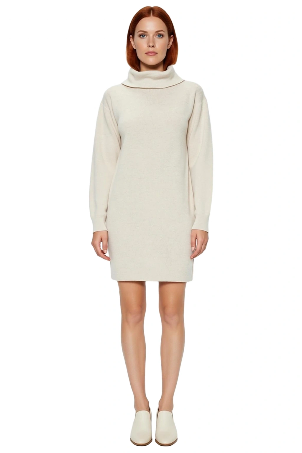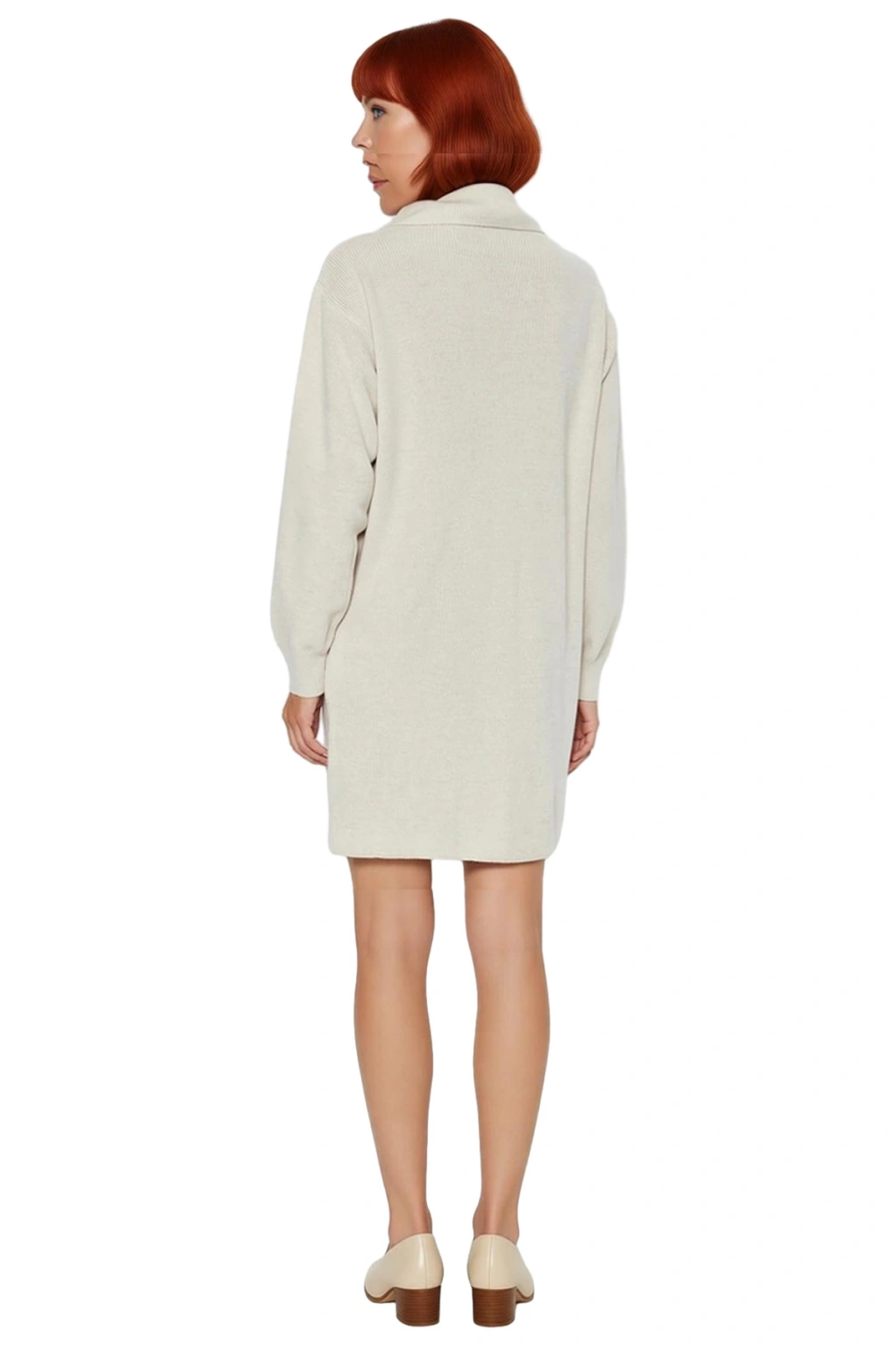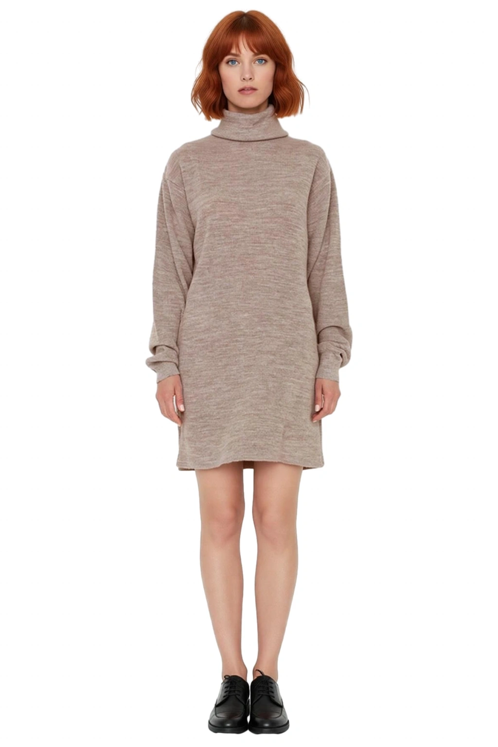Ürün Özellikleri: Shift kalıp, akrilik materyal, düz desen, balıkçı yaka, düşük kol, triko kumaş, bej renk, kapamasız tasarım.