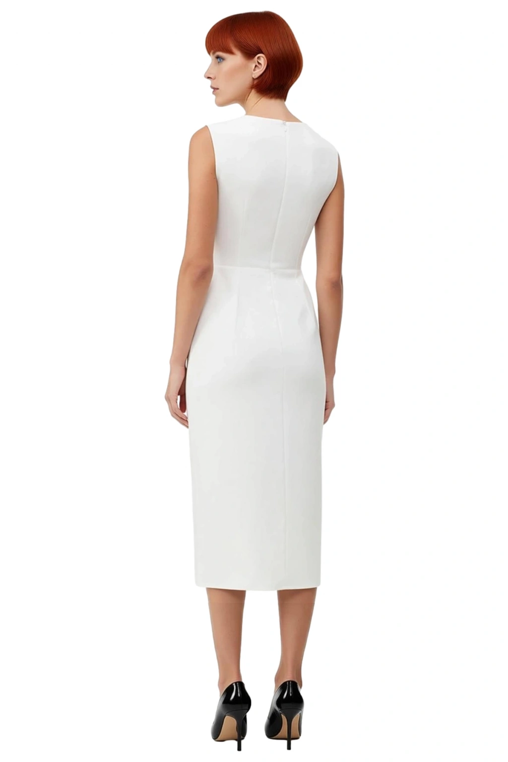 Ürün Özellikleri: Bodycon kalıp, polyester elastan materyal, düz desen, V yaka, kolsuz, dokuma kumaş, beyaz renk.