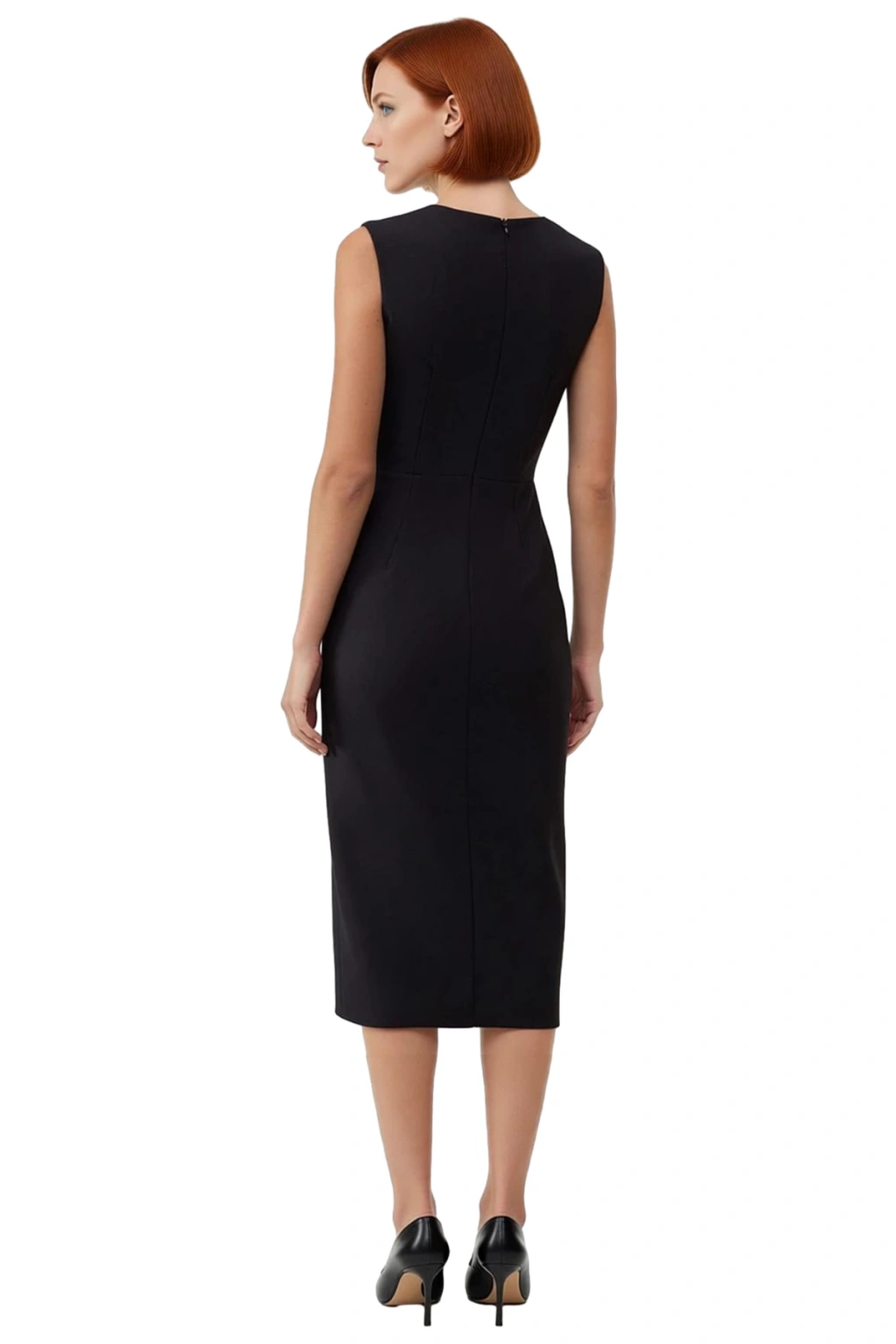 V yaka tasarımı, boyun bölgesine estetik bir dokunuş yaparken, kolsuz yapısı özellikle sıcak havalarda ideal bir seçimdir. Midi boyu, hem resmiyet hem de rahatlık arasında mükemmel bir denge kurar. Elbisenin ön kısmını süsleyen altın renkli düğmeler ve kemer tokasındaki ince detaylar, tasarımın genel şıklığını artırır. Astarsız olmasına rağmen, kaliteli dokuma kumaşı sayesinde konforlu ve güvenli bir kullanım sunar. Polyester ve elastan karışımı, elbiseye esneklik, dayanıklılık ve kolay bakım özellikleri kazandırır; böylece uzun süreli kullanımlarda bile ilk günkü formunu korur.