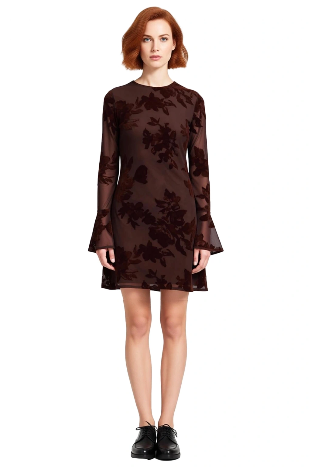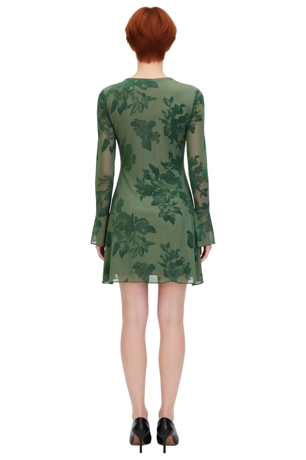 Ürün Özellikleri: Bodycon kalıp, 92% polyester 8% elastan materyal, çiçekli desen, bisiklet yaka, uzun flare kol, örme tül kumaş, haki renk, astarlı tasarım.
