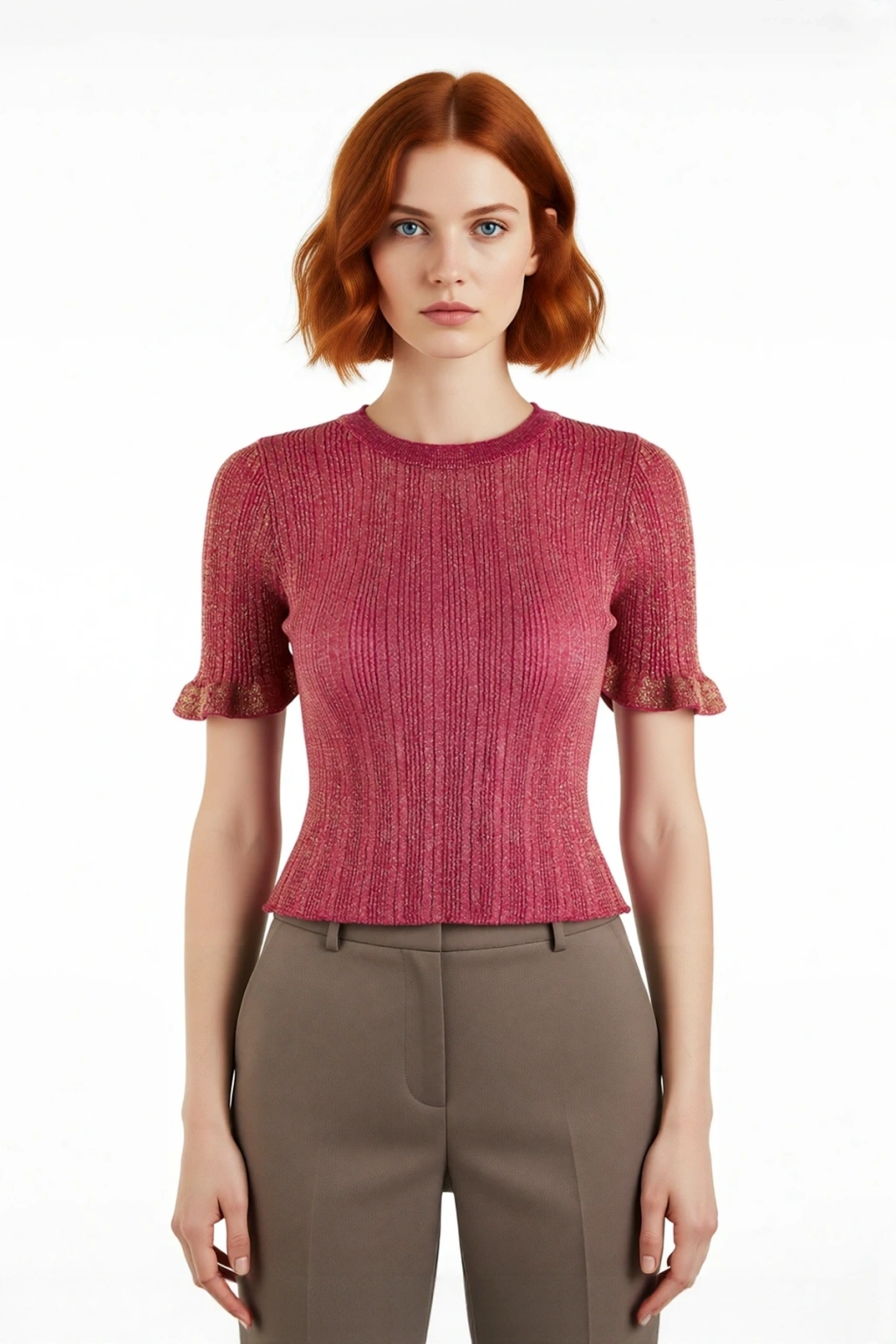 Ürün Özellikleri: Fitted kalıp, viskoz polyester metalize iplik materyal, düz desen, bisiklet yaka, fırfırlı kısa kol, triko kumaş, sarı renk.