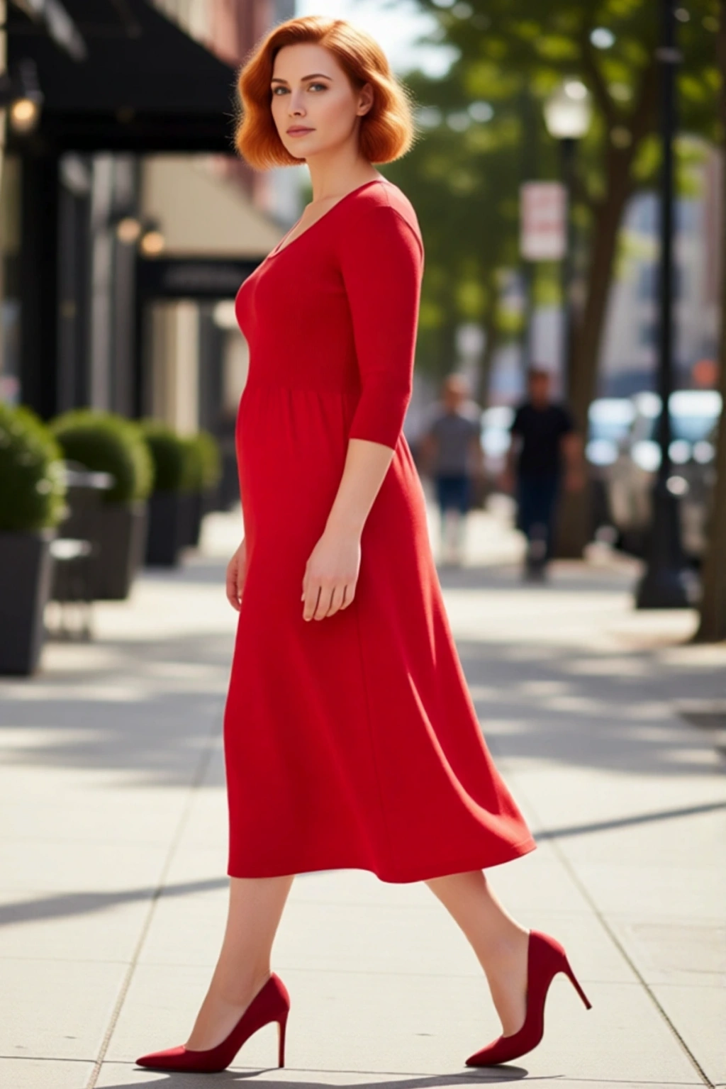 Ürün Özellikleri: A-line kalıp, viskoz poliamid materyal, düz desen, havuz yaka, truvakar kol, triko kumaş, kırmızı renk, fitilli dokuma.