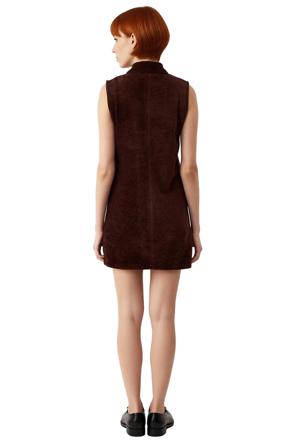 Ürün Özellikleri: A-line kalıp, 100% polyester materyal, düz desen, gömlek yaka, kolsuz kol, dokuma kumaş, kahverengi renk.