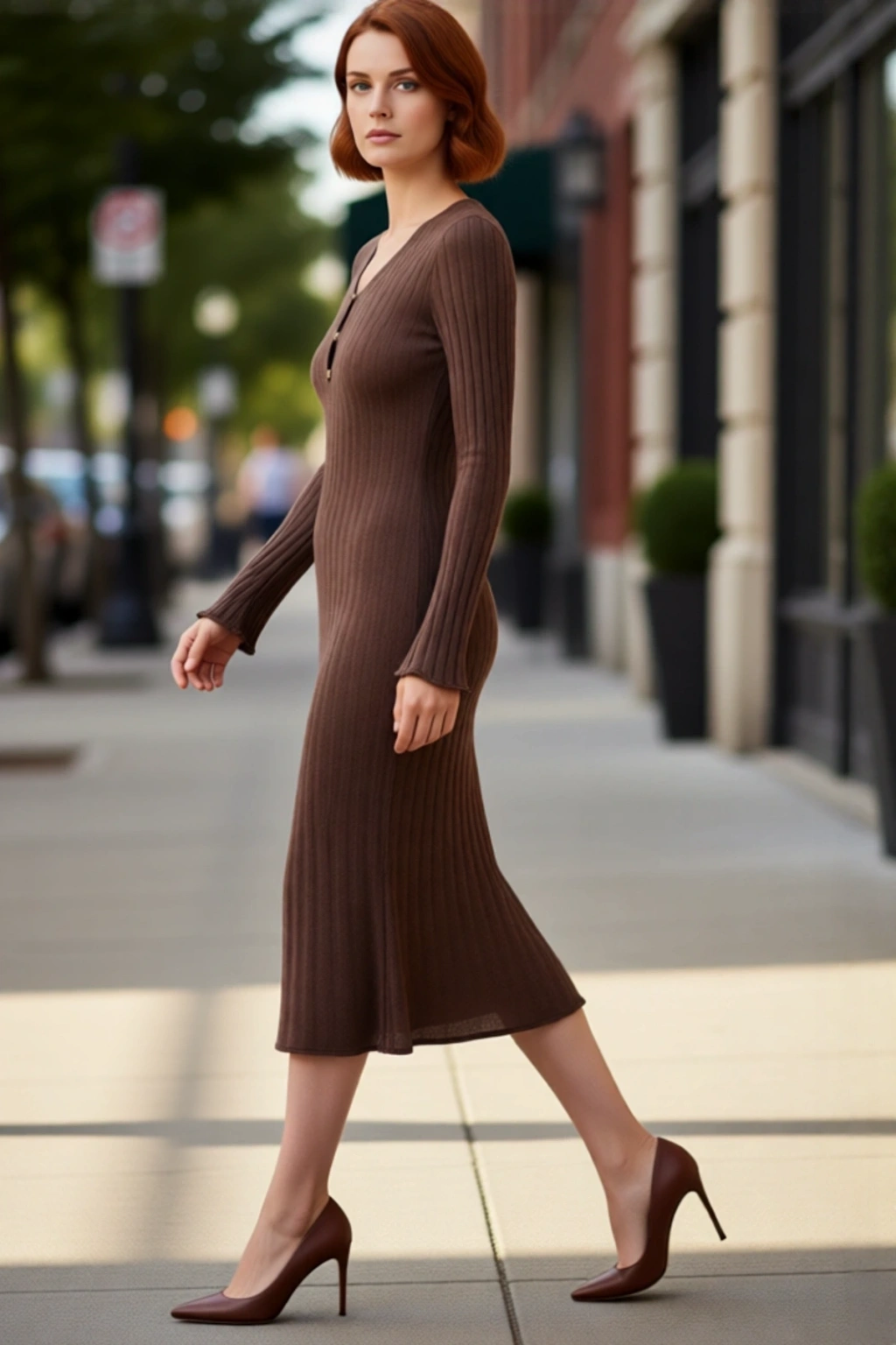 Ürün Özellikleri: A-line kalıp, akrilik materyal, düz desen, V yaka, standart kol, triko kumaş, kahverengi renk.