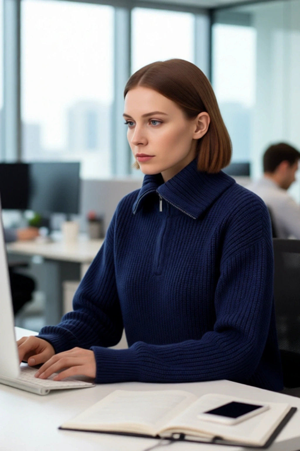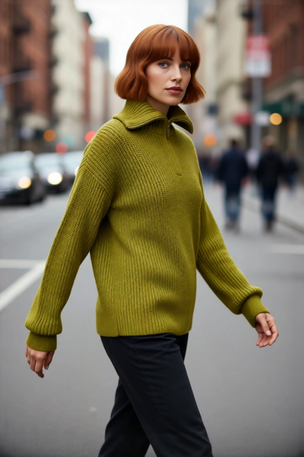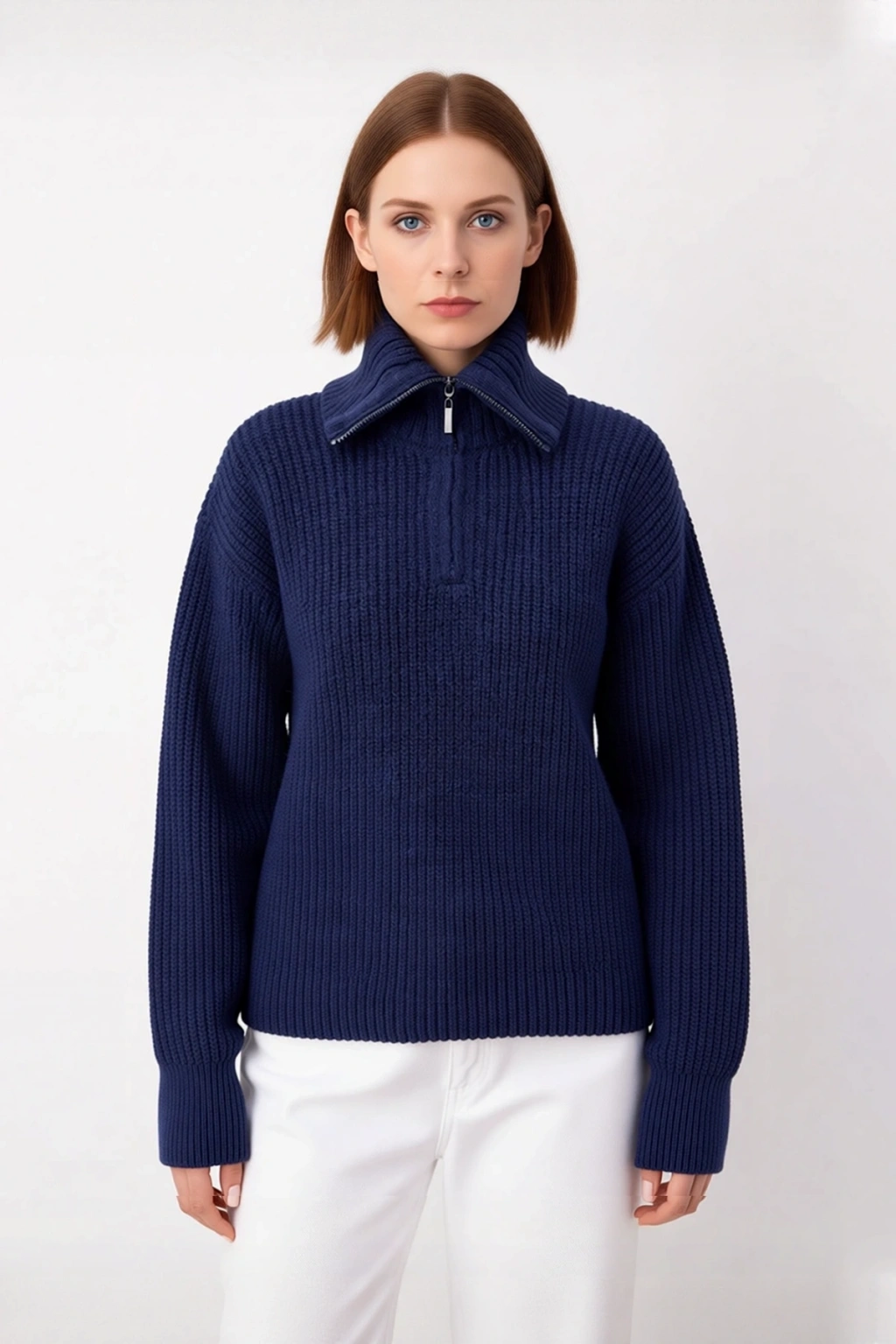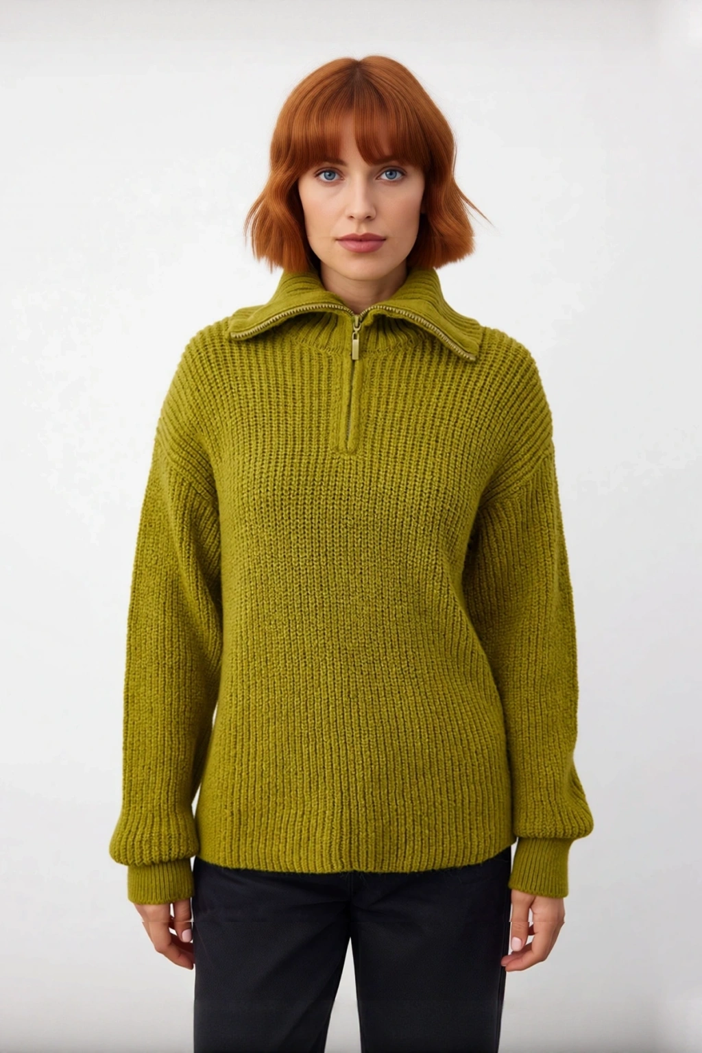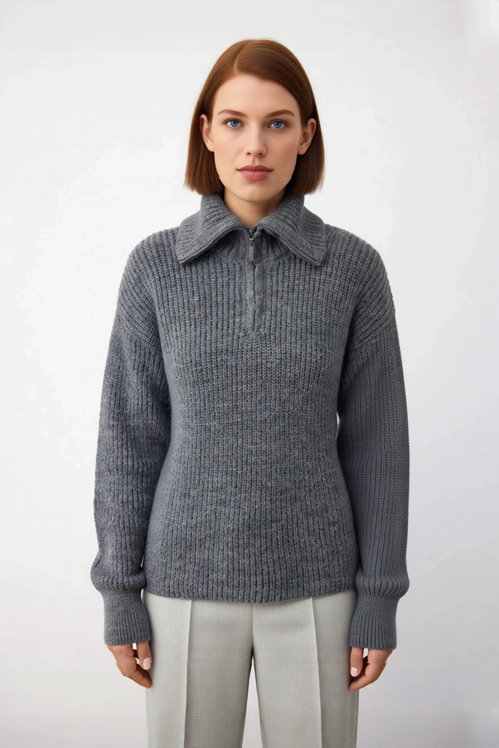 Fermuarlı dik yaka, rüzgarlı ve soğuk havalarda ekstra koruma sağlarken, aynı zamanda stilinize sportif ve dinamik bir dokunuş ekler. İsteğe bağlı olarak açılıp kapanabilen fermuar, farklı kullanım alternatifleri sunar. Düşük kol tipi ve uzun kol boyu, rahat bir oturuş sağlayarak kazağa modern bir siluet kazandırır. Selanik dokuma tipi, triko kumaşın dayanıklılığını artırırken, aynı zamanda görsel olarak zengin bir doku sunar. Triko kumaşın nefes alabilen yapısı, terlemeyi önleyerek gün boyu taze ve konforlu kalmanızı sağlar. Bu materyal karışımı, kazağın uzun ömürlü olmasını garantilerken, makinede kolayca yıkanabilir özelliği ile pratik kullanım sunar.