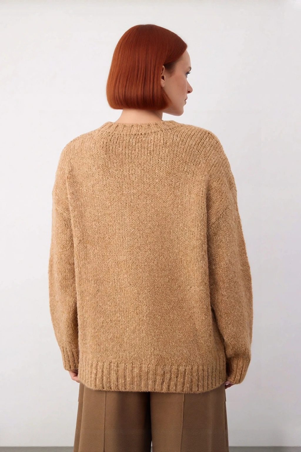 Ürün Özellikleri: Oversize kalıp, akrilik poliamid materyal, düz desen, bisiklet yaka, düşük kol, triko kumaş, kahverengi renk, tek plaka dokuma.