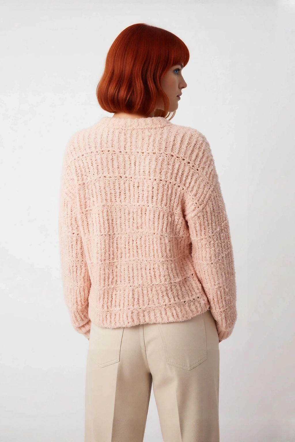Ürün Özellikleri: Oversize kalıp, akrilik/polyester materyal, dokulu desen, bisiklet yaka, düşük kol, triko kumaş, pembe renk, tek plaka dokuma.