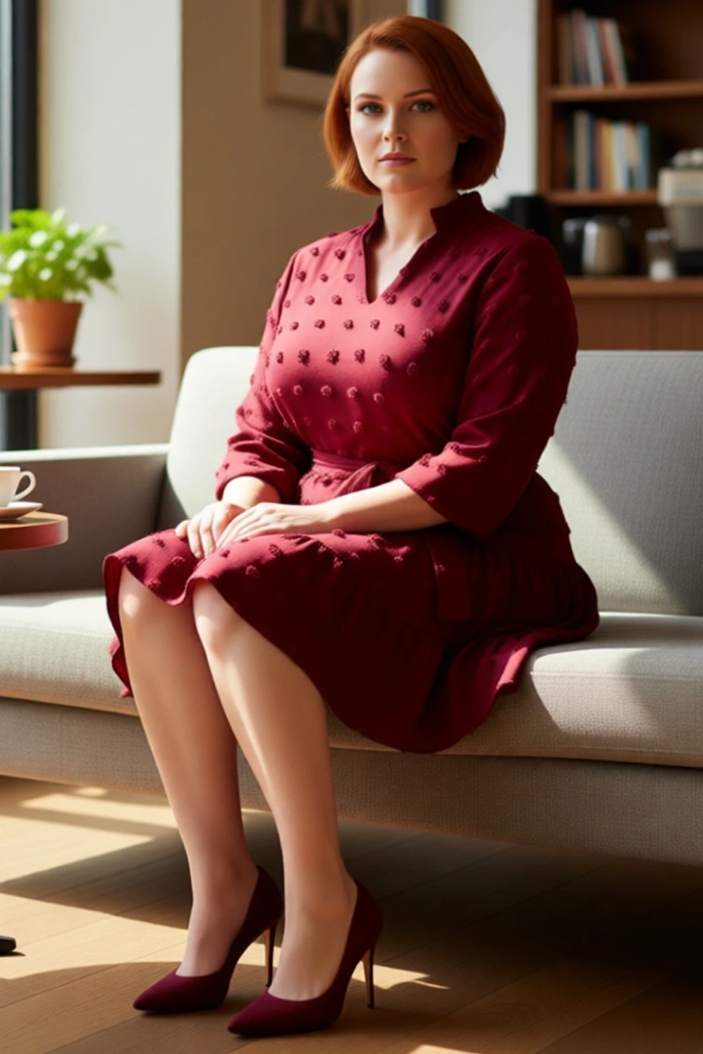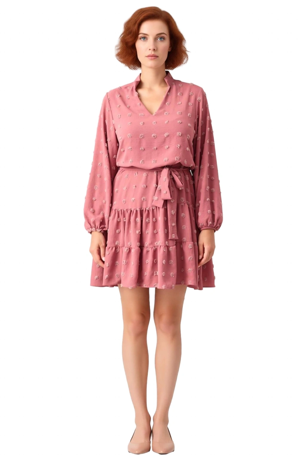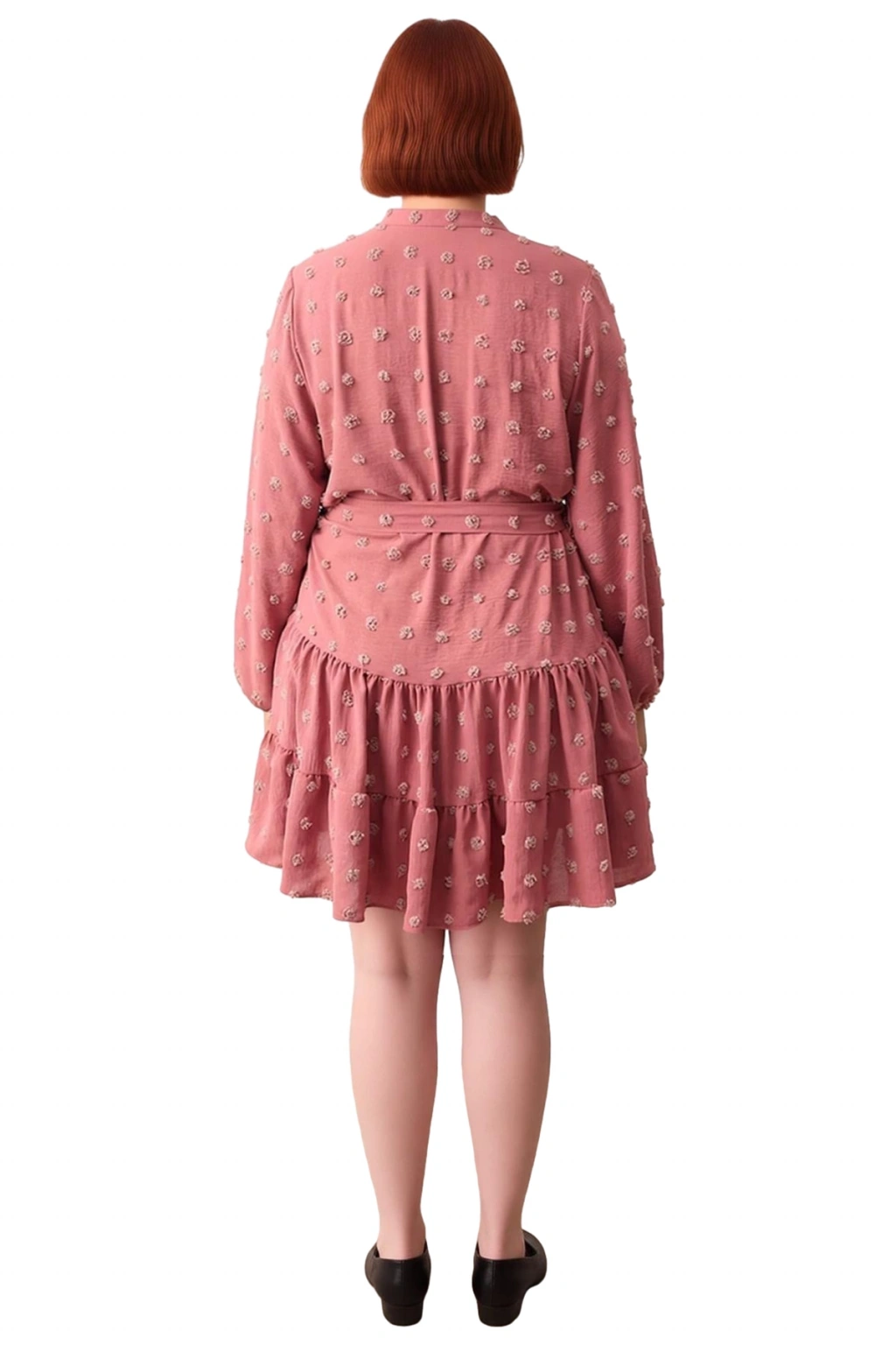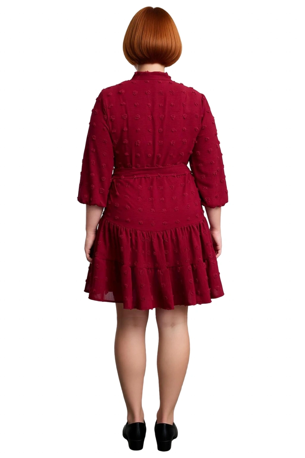 Ürün Özellikleri: A-line kalıp, %100 polyester materyal, dokulu desen, V yaka, standart kol, dokuma kumaş, bordo renk, mini boy, kuşaklı tasarım, büyük beden.