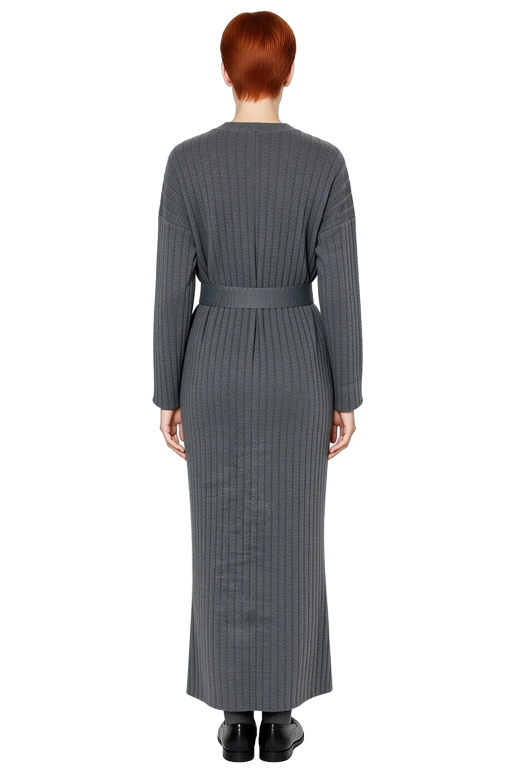 Ürün Özellikleri: A-line kalıp, akrilik materyal, düz desen, bisiklet yaka, düşük kol, triko kumaş, antrasit gri renk, kuşaklı tasarım.