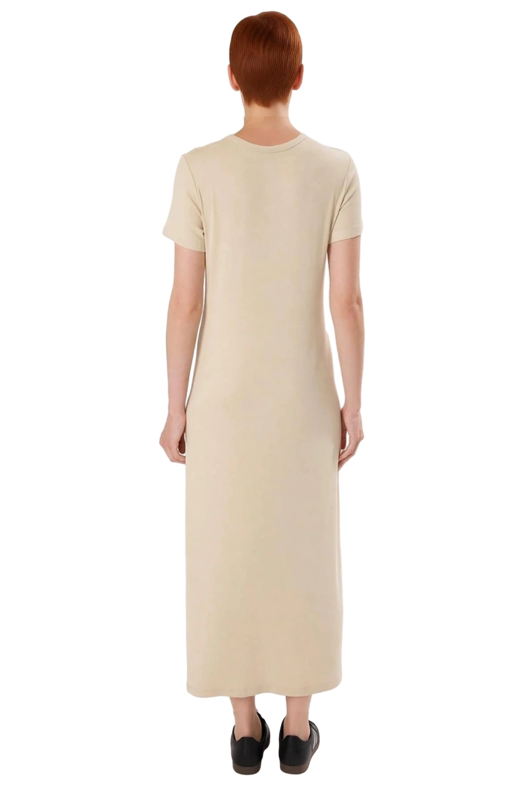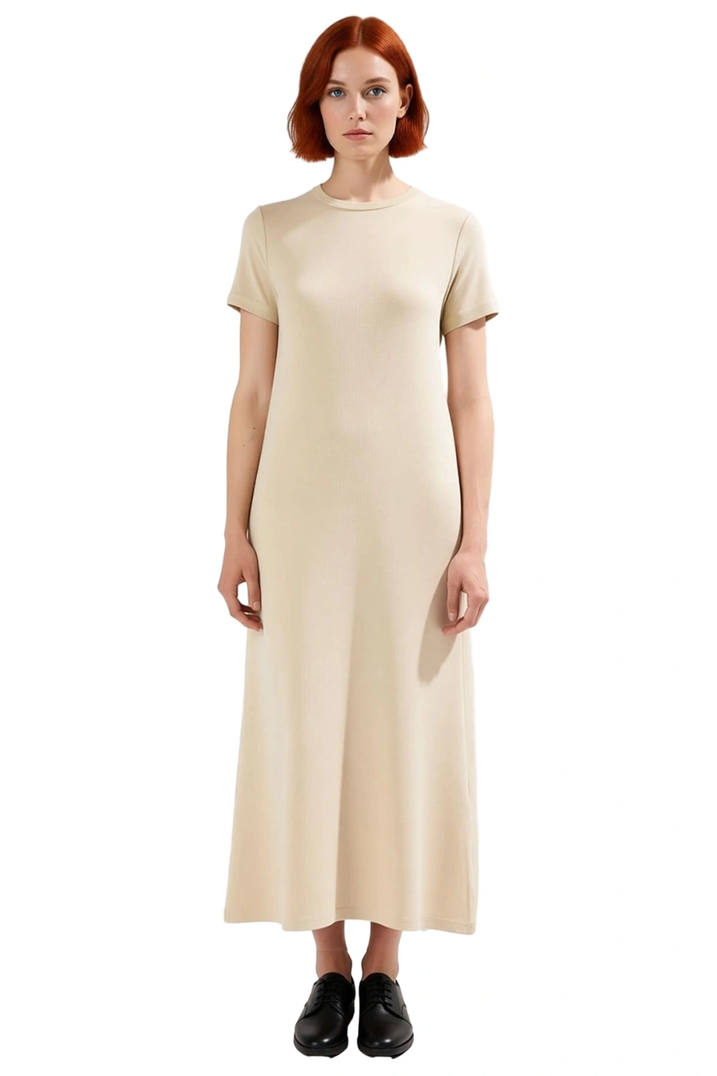 Ürün Özellikleri: Shift kalıp, %97 viskoz %3 elastan materyal, düz desen, bisiklet yaka, kısa standart kol, örme interlok kumaş, bej renk, astarsız tasarım.