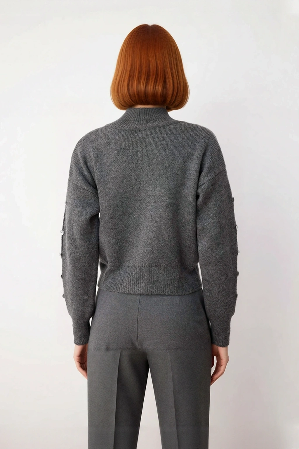Ürün Özellikleri: Regular kalıp, 80% akrilik 20% polyester materyal, düz desen, dik yaka, düşük kol, triko kumaş, gri renk, düğme detaylı tasarım.