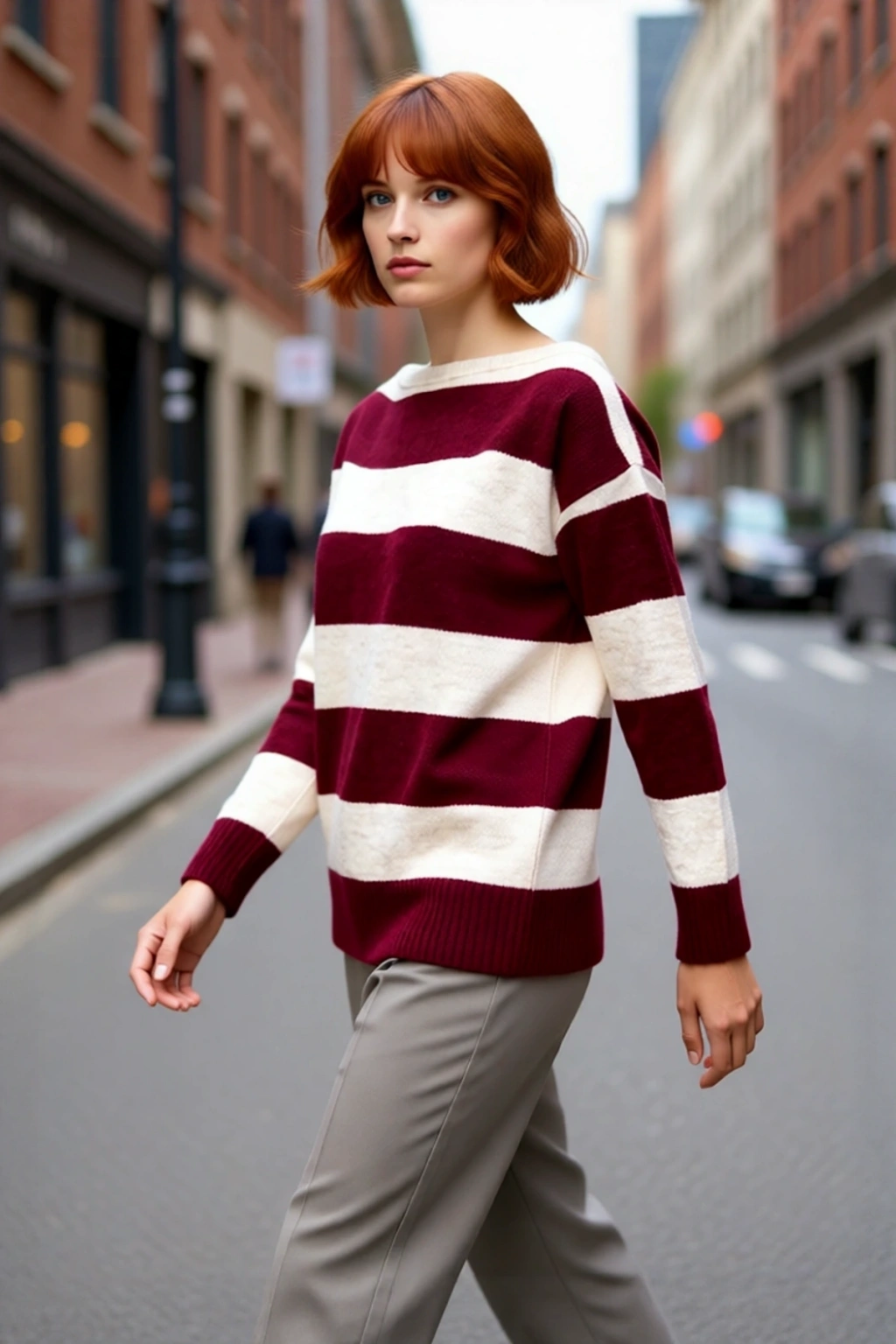 Ürün Özellikleri: Oversize kalıp, akrilik polyester karışım materyal, renk bloklu çizgili desen, kayık yaka, standart kol, triko kumaş, ekru bordo renk.