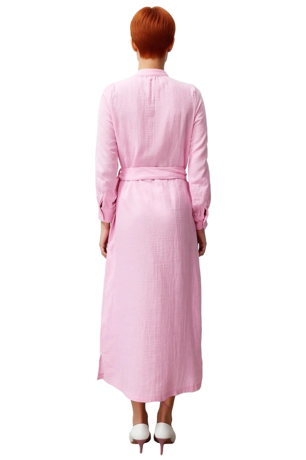 Ürün Özellikleri: Shift kalıp, %100 pamuk materyal, düz desen, hakim yaka, standart kol, dokuma kumaş, pembe renk, kuşaklı tasarım.