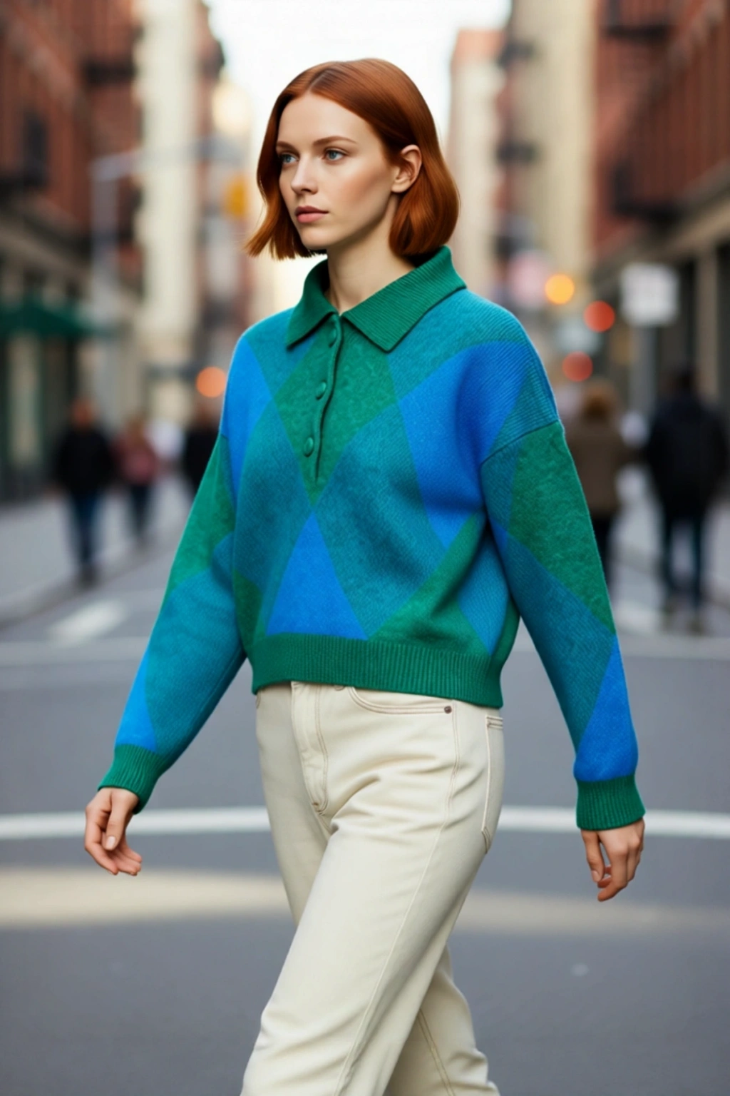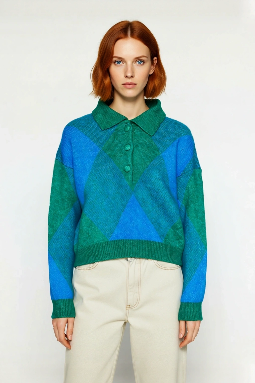 Ürün Özellikleri: Oversize kalıp, akrilik ve polyester materyal, baklava desen, polo yaka, düşük kol, triko kumaş, çok renkli.