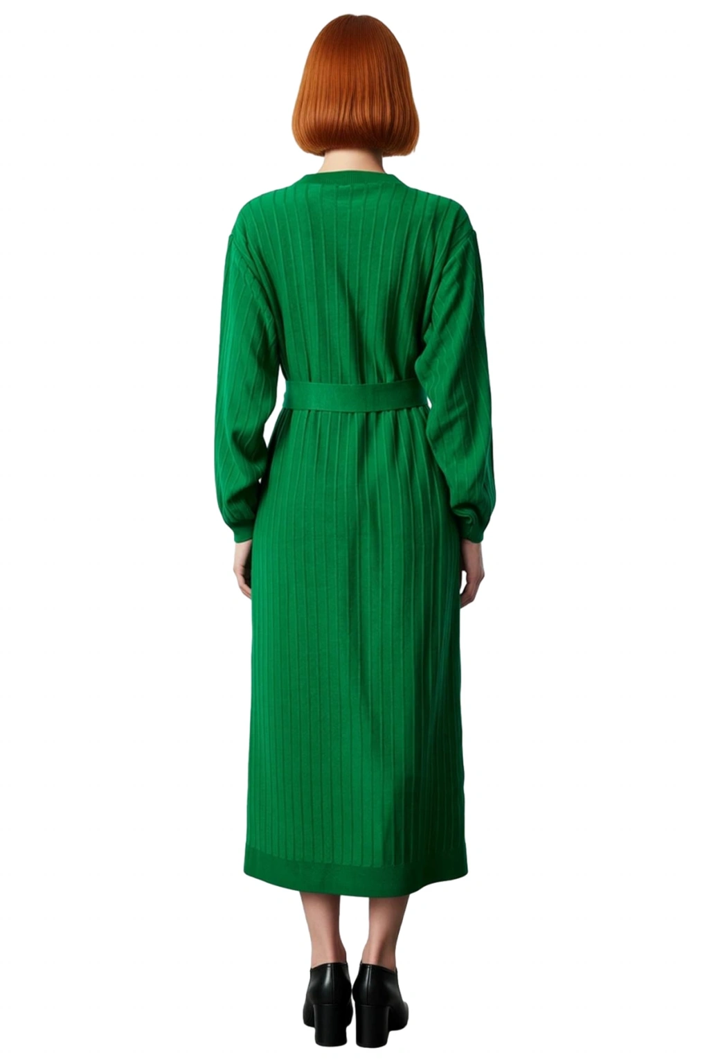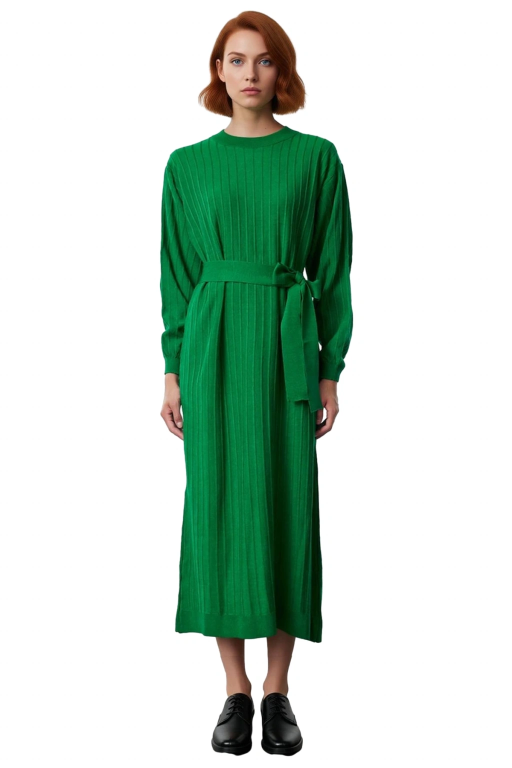 Ürün Özellikleri: Shift kalıp, %100 akrilik materyal, düz desen, bisiklet yaka, balon kol, triko kumaş, yeşil renk, kuşaklı tasarım.
