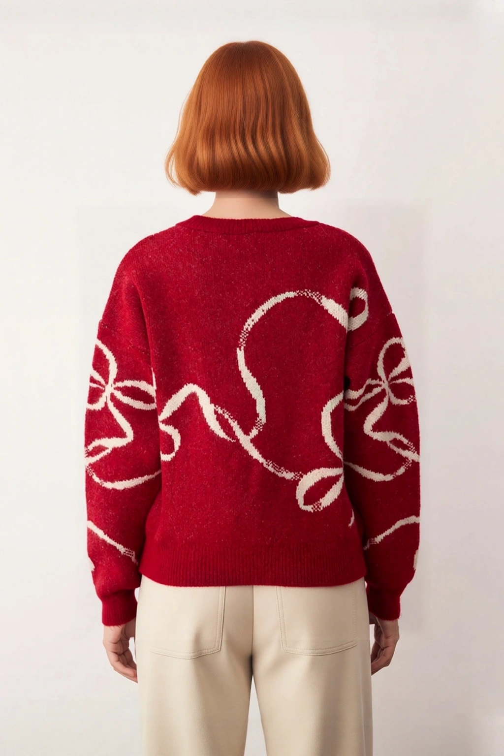 Ürün Özellikleri: Regular kalıp, akrilik ve polyester materyal, yılbaşı temalı desen, bisiklet yaka, düşük kol, triko kumaş, kırmızı renk, orta kalınlık.
