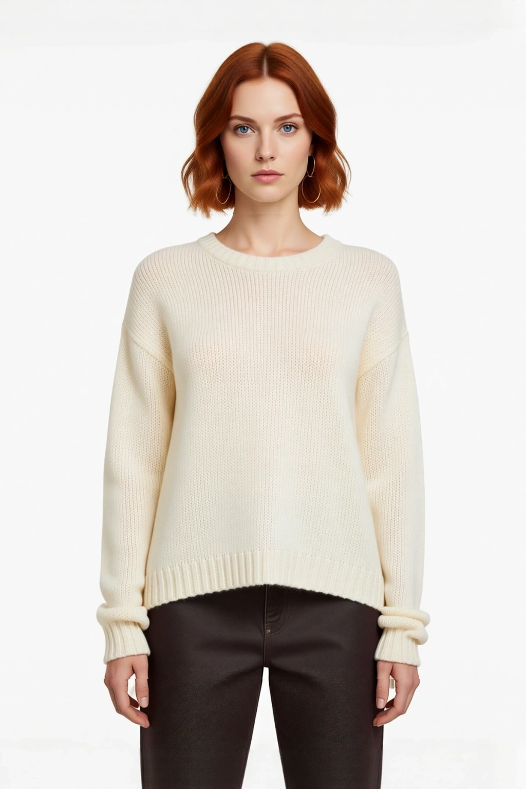Ürün Özellikleri: Oversize kalıp, akrilik polyester karışım materyal, düz püskül detaylı desen, bisiklet yaka, düşük kol, triko kumaş, ekru renk.