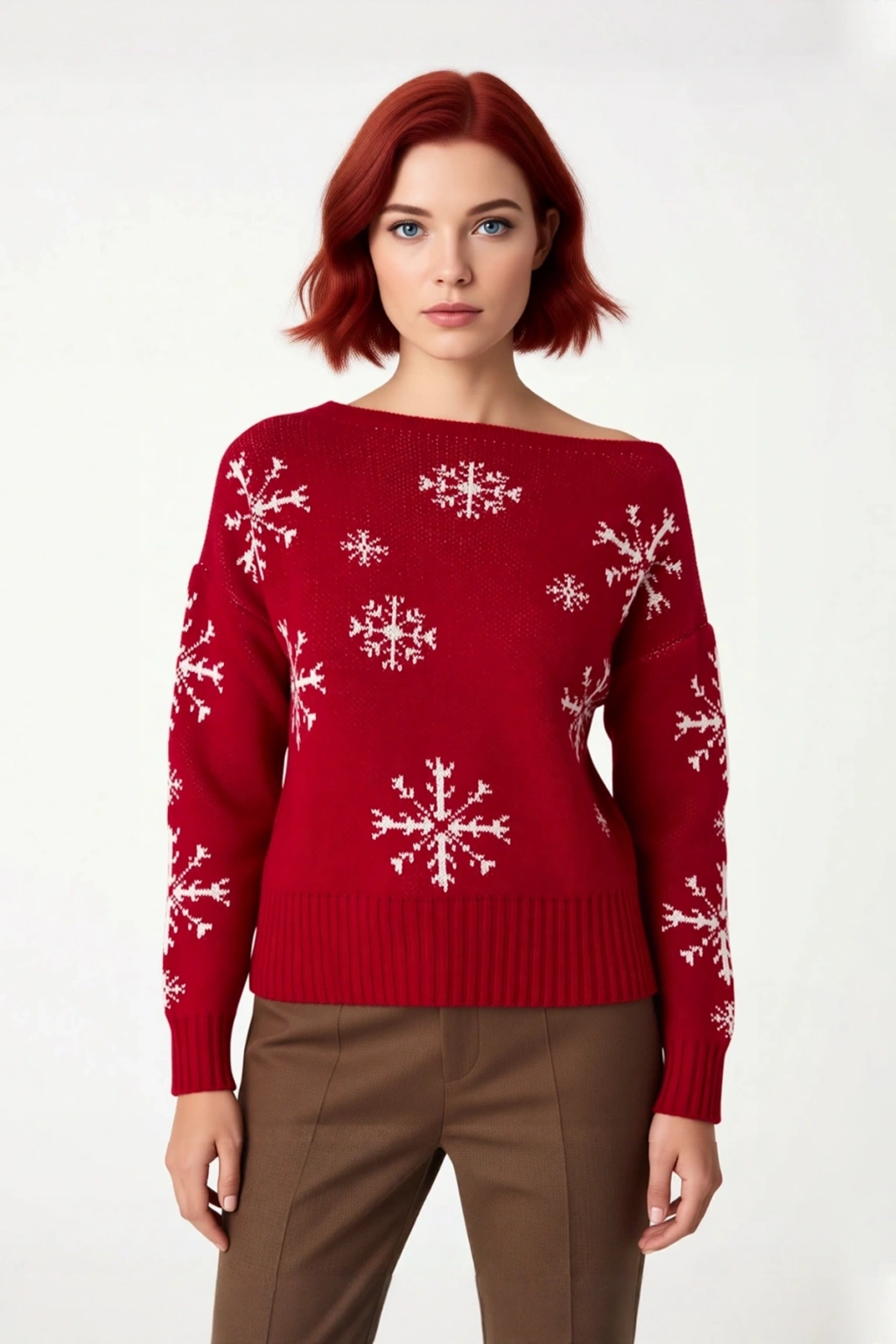 Ürün Özellikleri: Oversize kalıp, akrilik materyal, yılbaşı desen, kayık yaka, standart kol, triko kumaş, kırmızı renk.