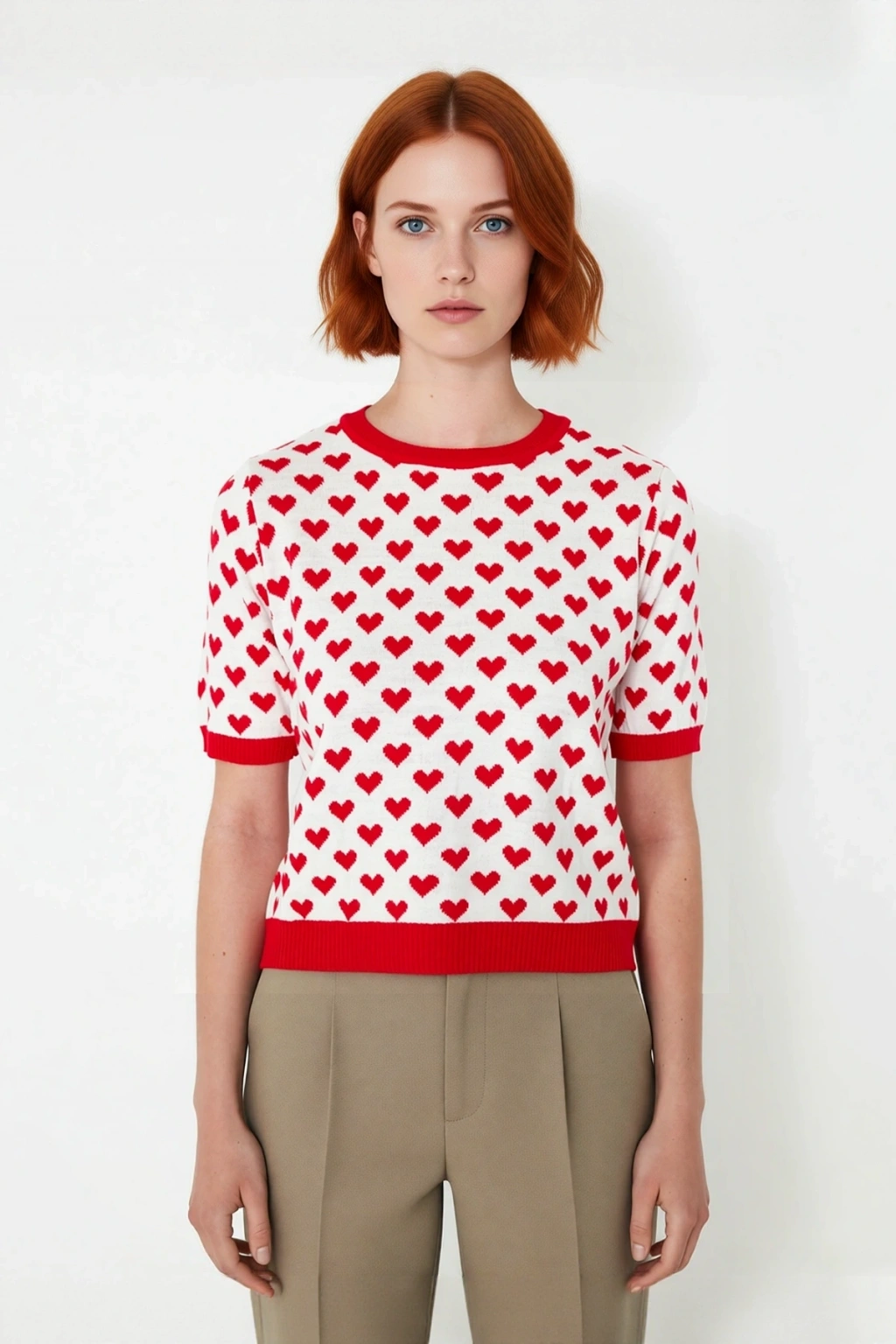 Ürün Özellikleri: Regular kalıp, akrilik materyal, kalp desen, bisiklet yaka, kısa standart kol, triko kumaş, kırmızı renk, cepsiz tasarım.