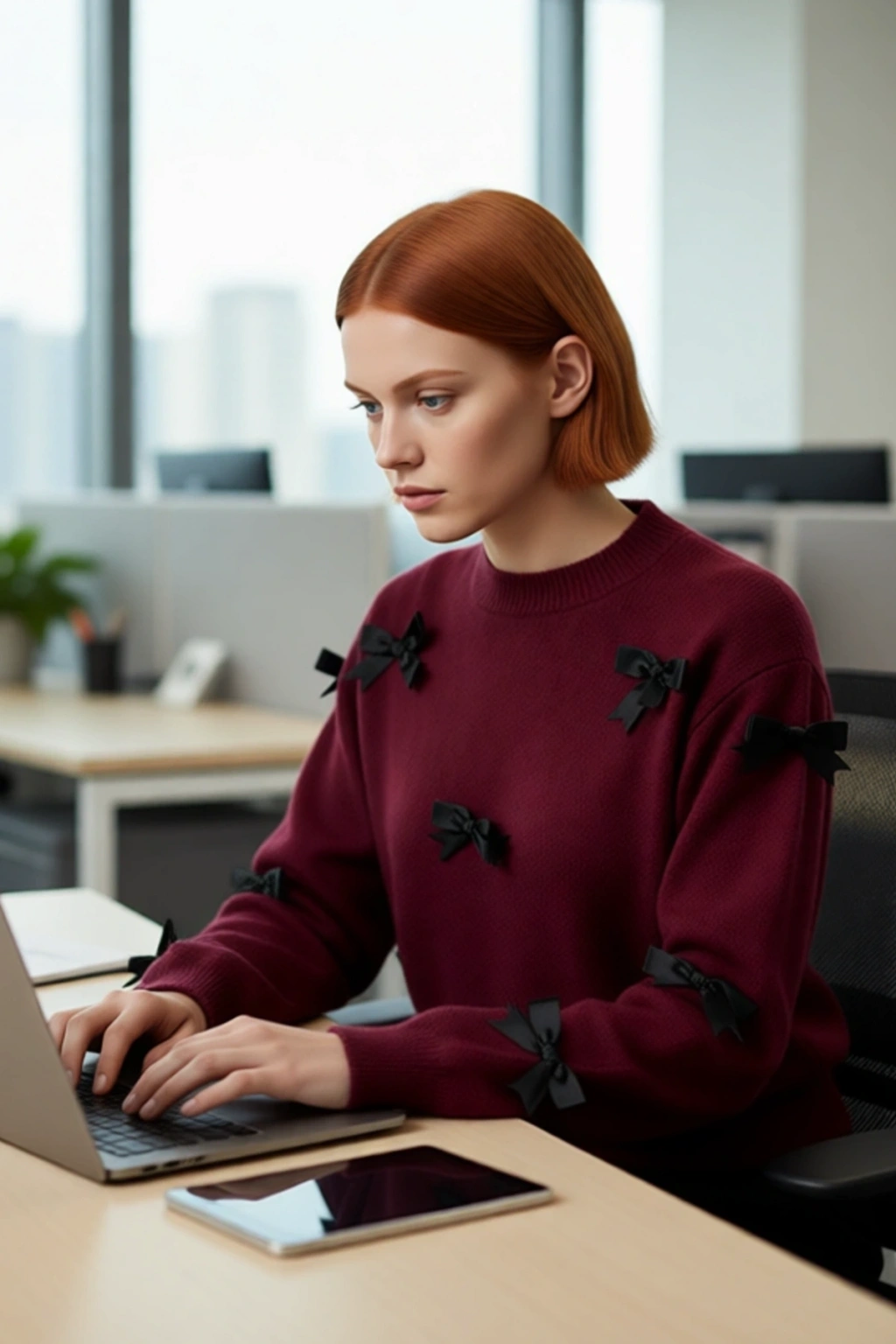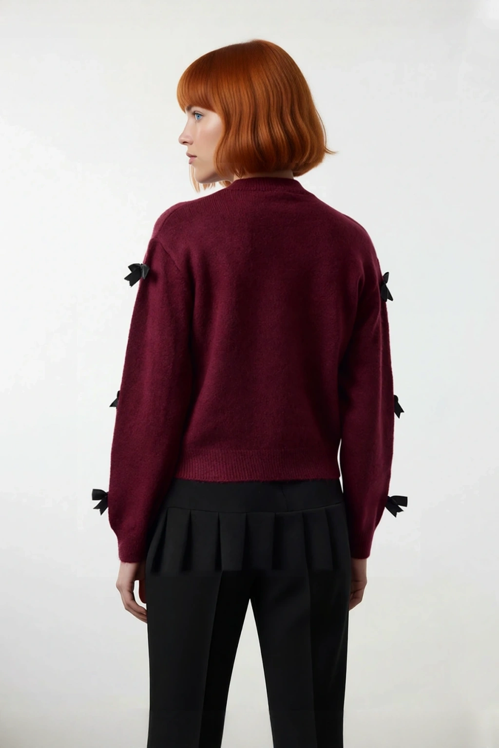 Ürün Özellikleri: Regular kalıp, akrilik ve polyester materyal, kurdeleli desen, bisiklet yaka, standart kol, triko kumaş, bordo renk, baskısız tasarım.