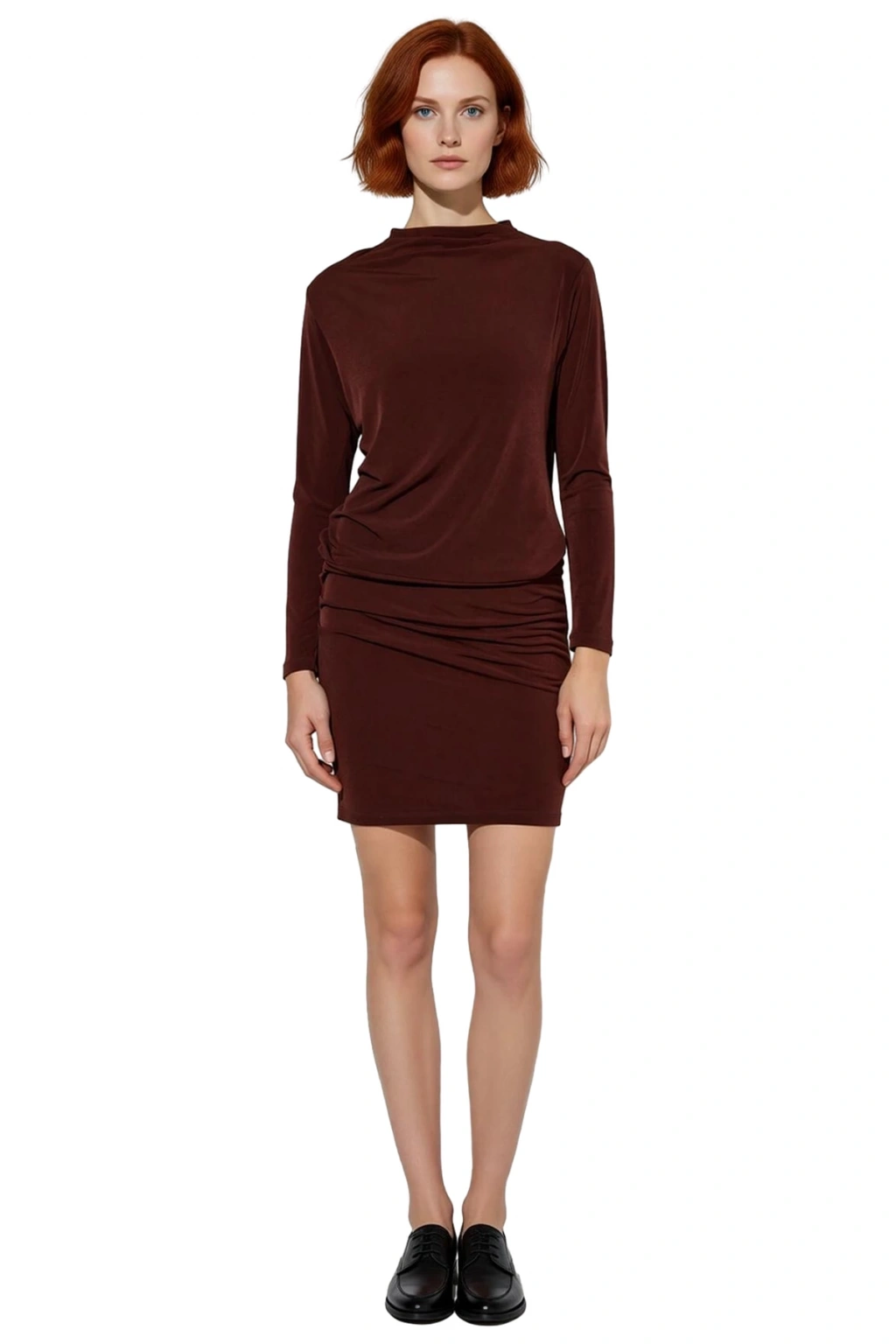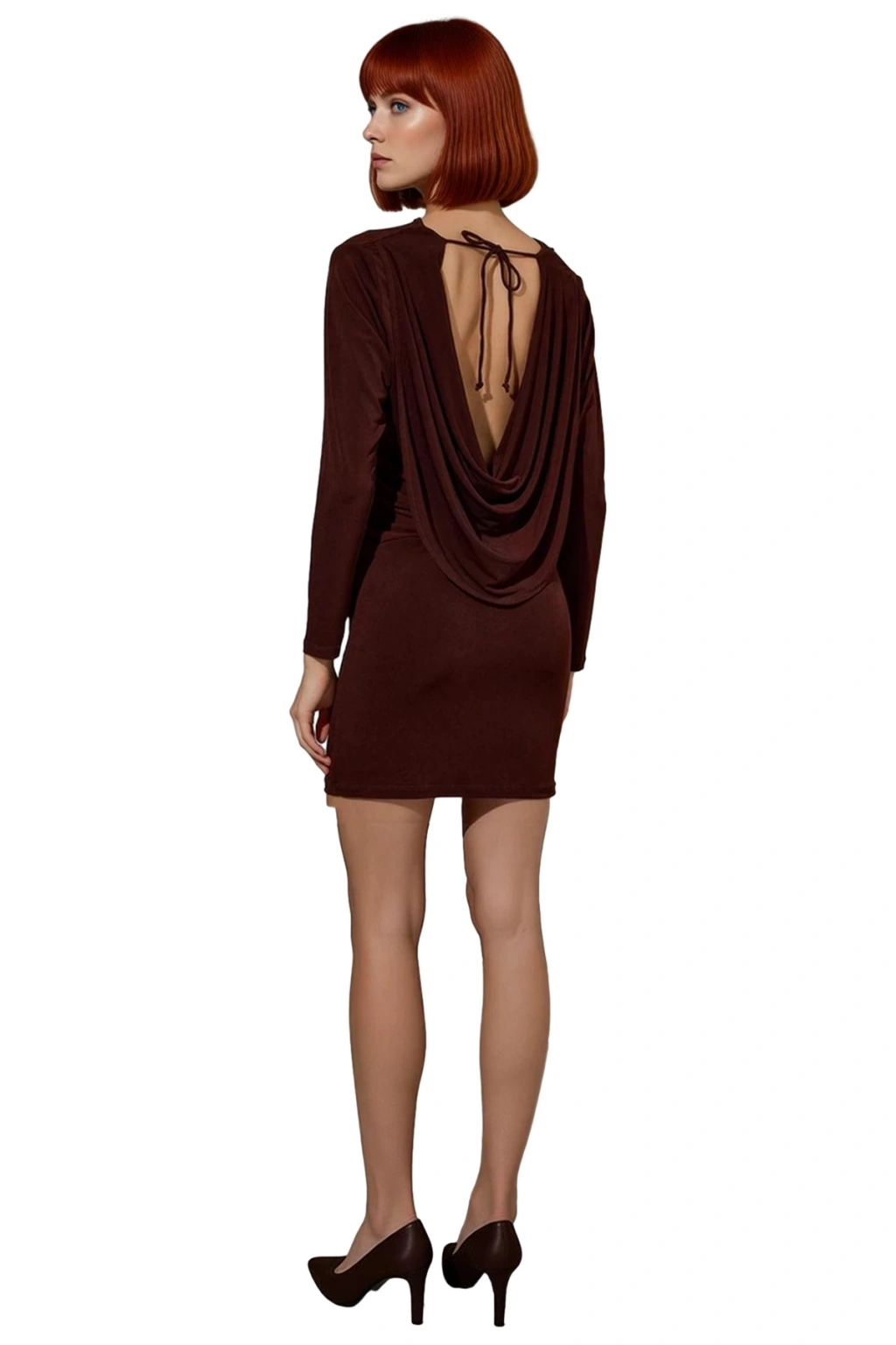 Ürün Özellikleri: Bodycon kalıp, 96% polyester 4% elastan materyal, düz desen, kayık yaka, standart uzun kol, örme kumaş, kahverengi renk, sırt dekolteli tasarım, astarlı.