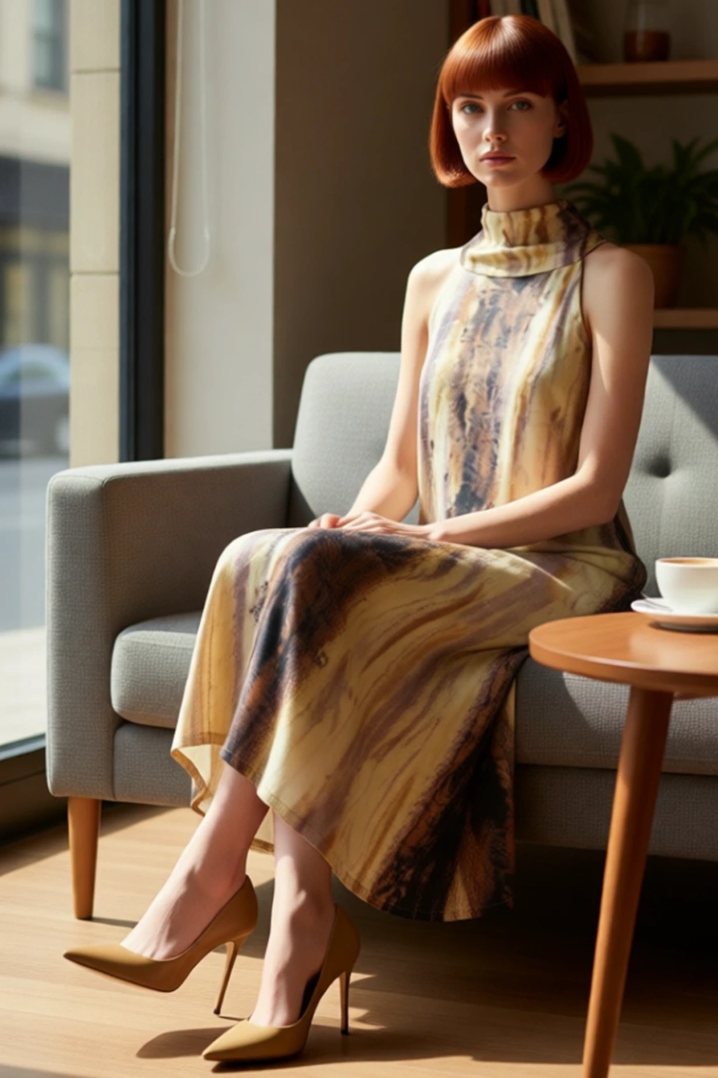 Ürün Özellikleri: Shift kalıp, 100% polyester materyal, soyut desen, halter yaka, kolsuz kol, dokuma saten kumaş, sarı renk.