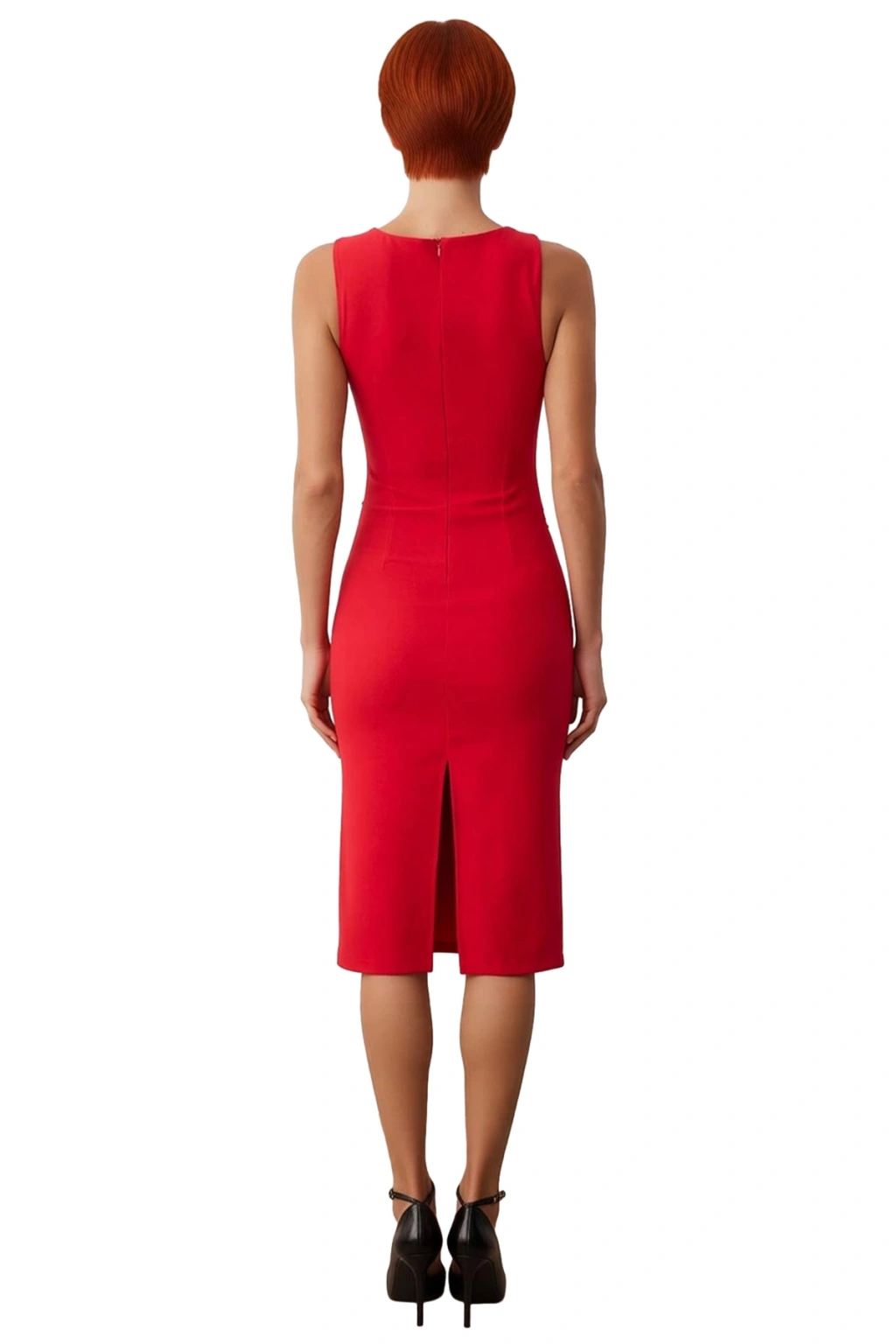 Ürün Özellikleri: Bodycon kalıp, polyester-elastan materyal, düz desen, asimetrik yaka, kolsuz, dokuma kumaş, kırmızı renk.