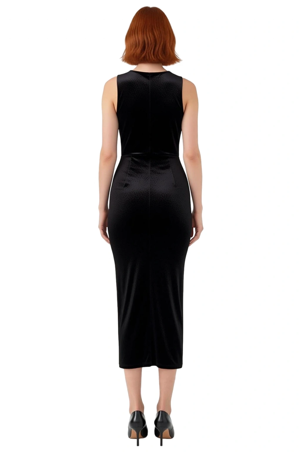 Ürün Özellikleri: Bodycon kalıp, polyester materyal, düz desen, asimetrik yaka, tek omuz kol, örme kadife kumaş, siyah renk.