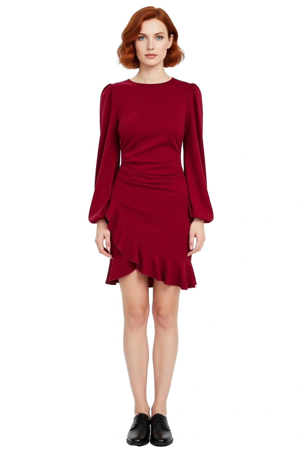 Ürün Özellikleri: Bodycon kalıp, %98 polyester %2 elastan materyal, düz desen, bisiklet yaka, balon kol, krep dokuma kumaş, kırmızı renk, volanlı detay.