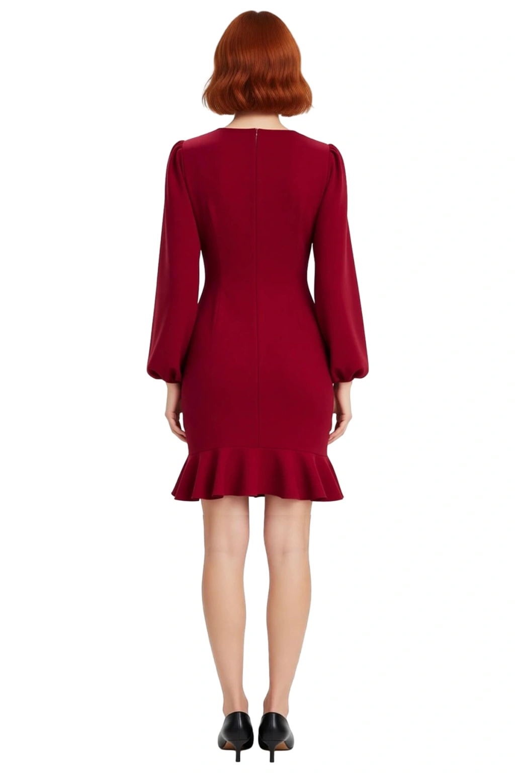 Ürün Özellikleri: Bodycon kalıp, polyester karışımlı materyal, düz desen, bisiklet yaka, balon kol, krep dokuma kumaş, kırmızı renk, volanlı fırfırlı tasarım.