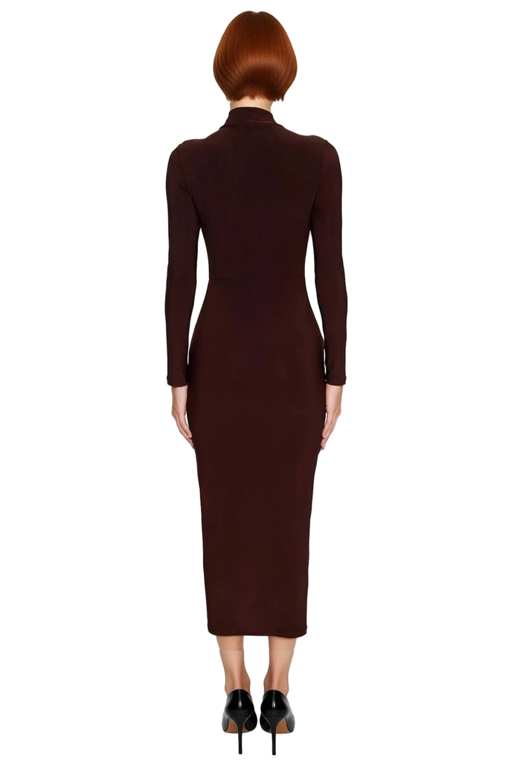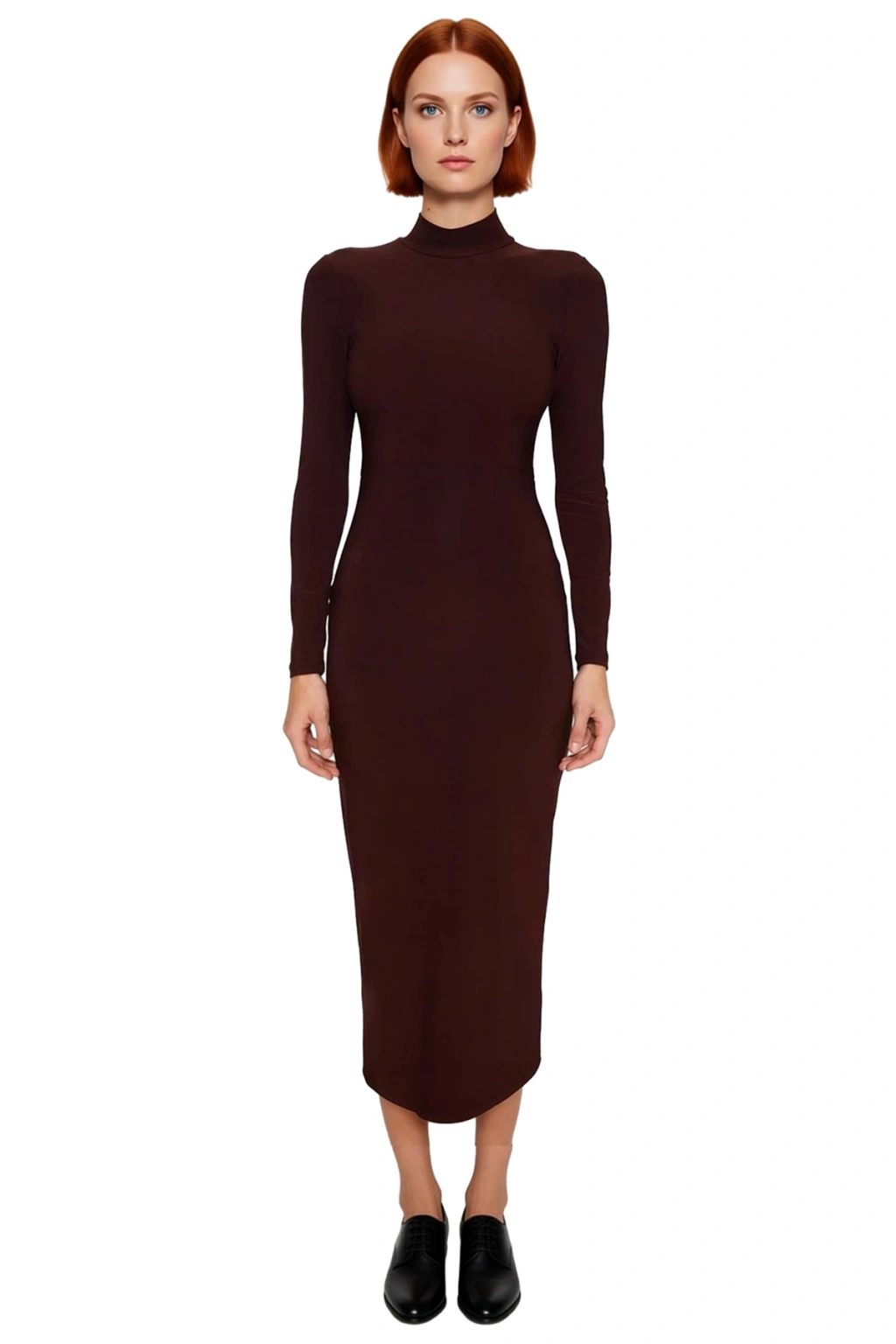 Ürün Özellikleri: Bodycone siluet, polyester karışımlı materyal, düz desen, dik yaka, standart uzun kol, kalın sandy örme kumaş, kahverengi renk, baskısız tasarım, kemersiz.