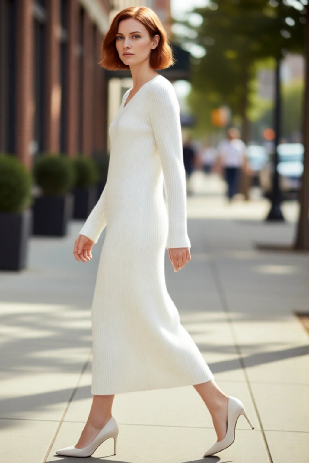 V yaka detayı, feminen bir dokunuş katarken, standart uzun kolları soğuk havalara karşı ekstra koruma sağlar. Orta kalınlıktaki triko kumaşı, nefes alabilen yapısıyla terletmez ve rahat bir kullanım deneyimi sunar. Cepsiz tasarımı, elbisenin akıcı siluetini bozmadan modern bir çizgi yakalar. Maxi boyu, bacakları tamamen örterek hem sıcak tutar hem de zarif bir görünüm oluşturur. Bu elbise, tek plaka dokuma tipi sayesinde kaliteli bir işçilik sunar ve uzun ömürlü kullanım vaat eder. Kolay bakım talimatları (T41) sayesinde pratik bir üründür. Casual ve günlük kullanım için mükemmel bir seçimdir.