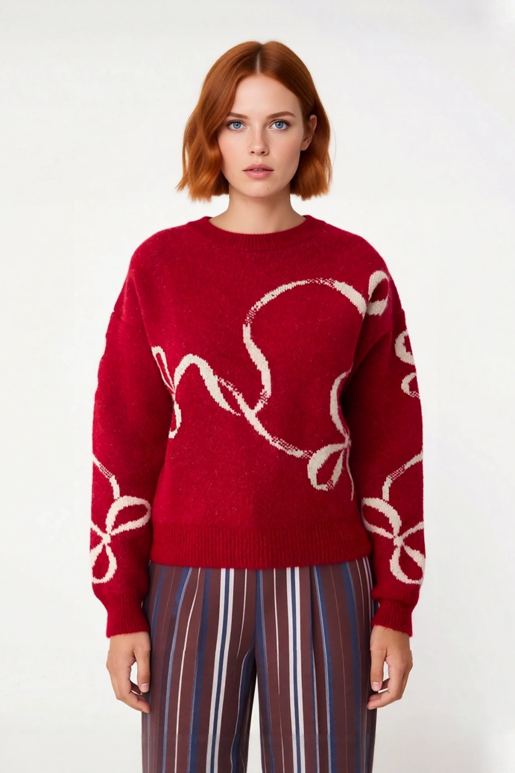 Ürün Özellikleri: Regular kalıp, akrilik ve polyester materyal, yılbaşı temalı desen, bisiklet yaka, düşük kol, triko kumaş, kırmızı renk, orta kalınlık.