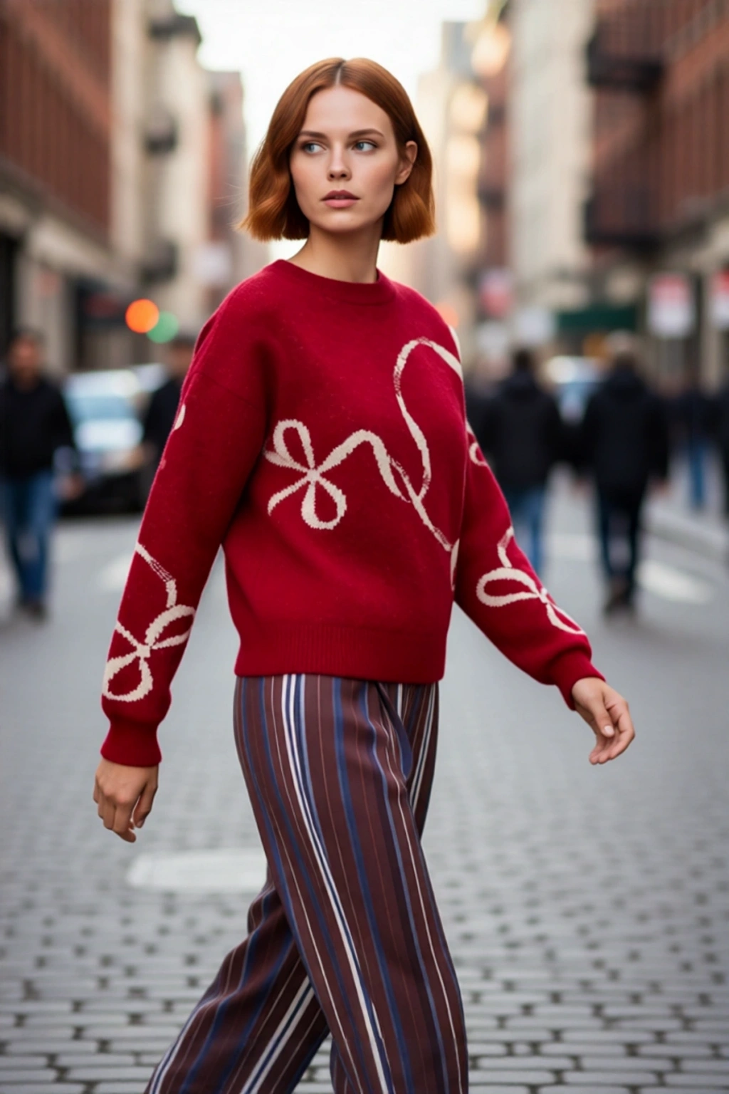 Bu Kadınlar İçin Yılbaşı Temalı Desenli Yumuşak Dokulu Rahat Kalıp Bisiklet Yaka Triko Kazak, kış sezonunun soğuk günlerinde sizi sıcacık tutarken şıklığınızdan ödün vermemenizi sağlar. Regular kalıbı sayesinde vücudunuza rahatça oturur ve gün boyu konfor sunar. Yüksek kaliteli akrilik ve polyester karışımı materyali (%75 Akrilik, %25 Polyester) yumuşacık bir dokunuş hissi verirken, yılbaşı temalı desenleri ve kırmızı rengi ile bayram ruhunu üzerinize taşır. Bu orta kalınlıktaki triko kazak, casual ve günlük kullanımlar için idealdir.