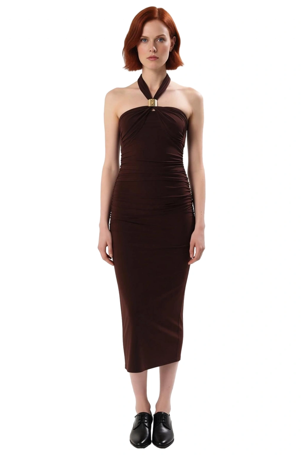 Ürün Özellikleri: Bodycon kalıp, polyester materyal, düz desen, asimetrik yaka, kolsuz, örme kumaş, kahverengi renk, aksesuar detaylı.