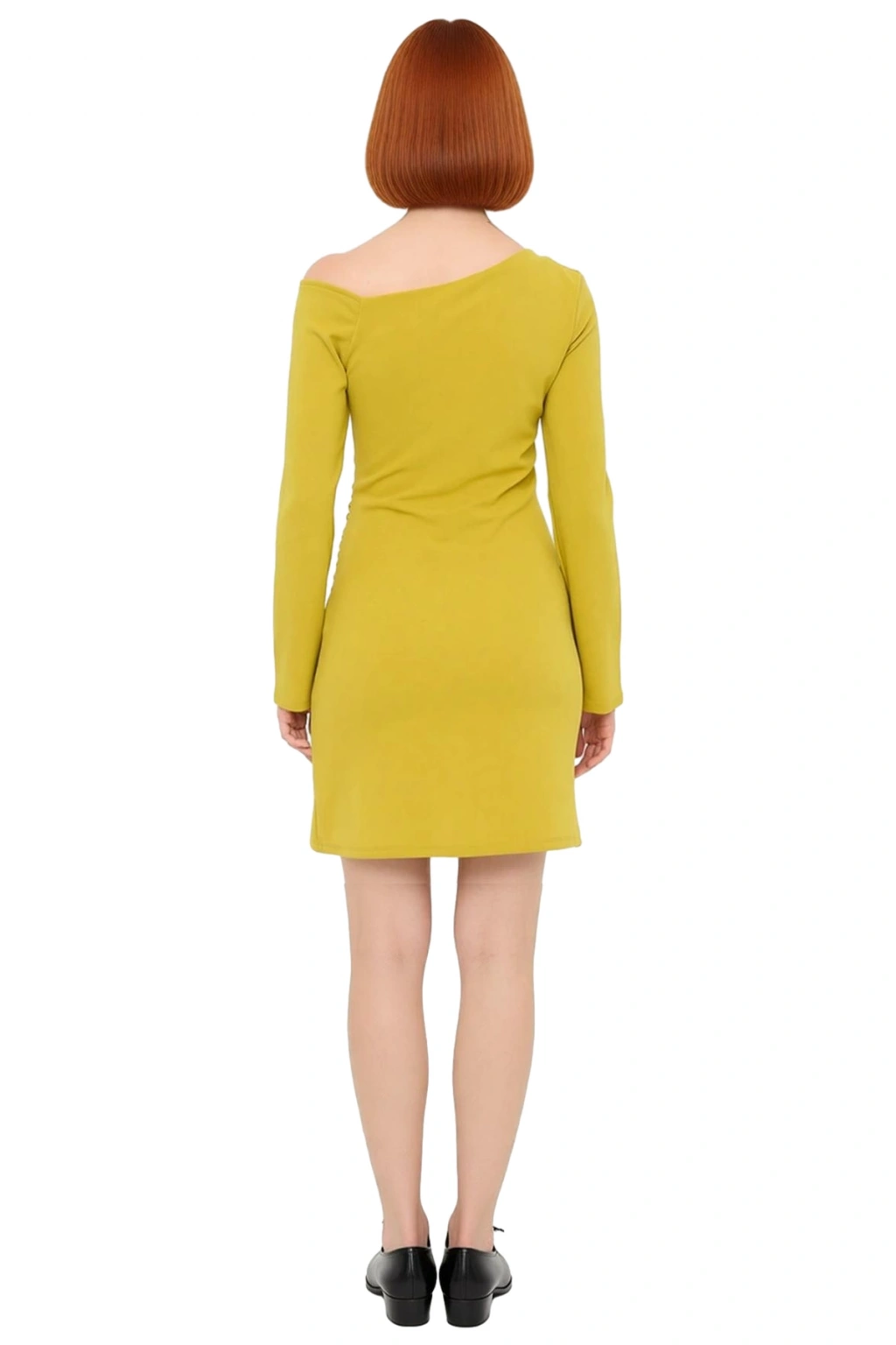 Ürün Özellikleri: A-line kalıp, 96% polyester 4% elastan materyal, düz desen, asimetrik yaka, düşük kol, örme kumaş, yeşil renk, büzgü / drape detay.