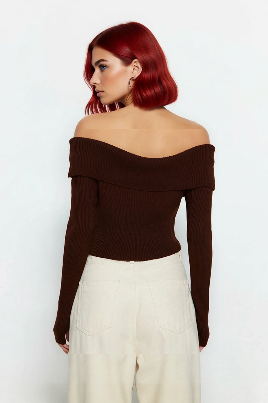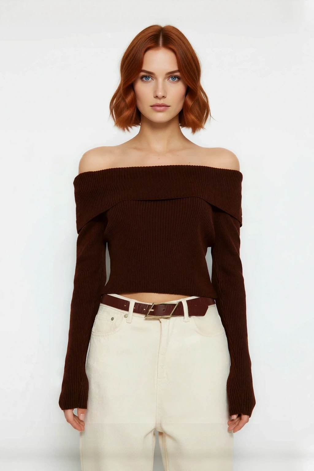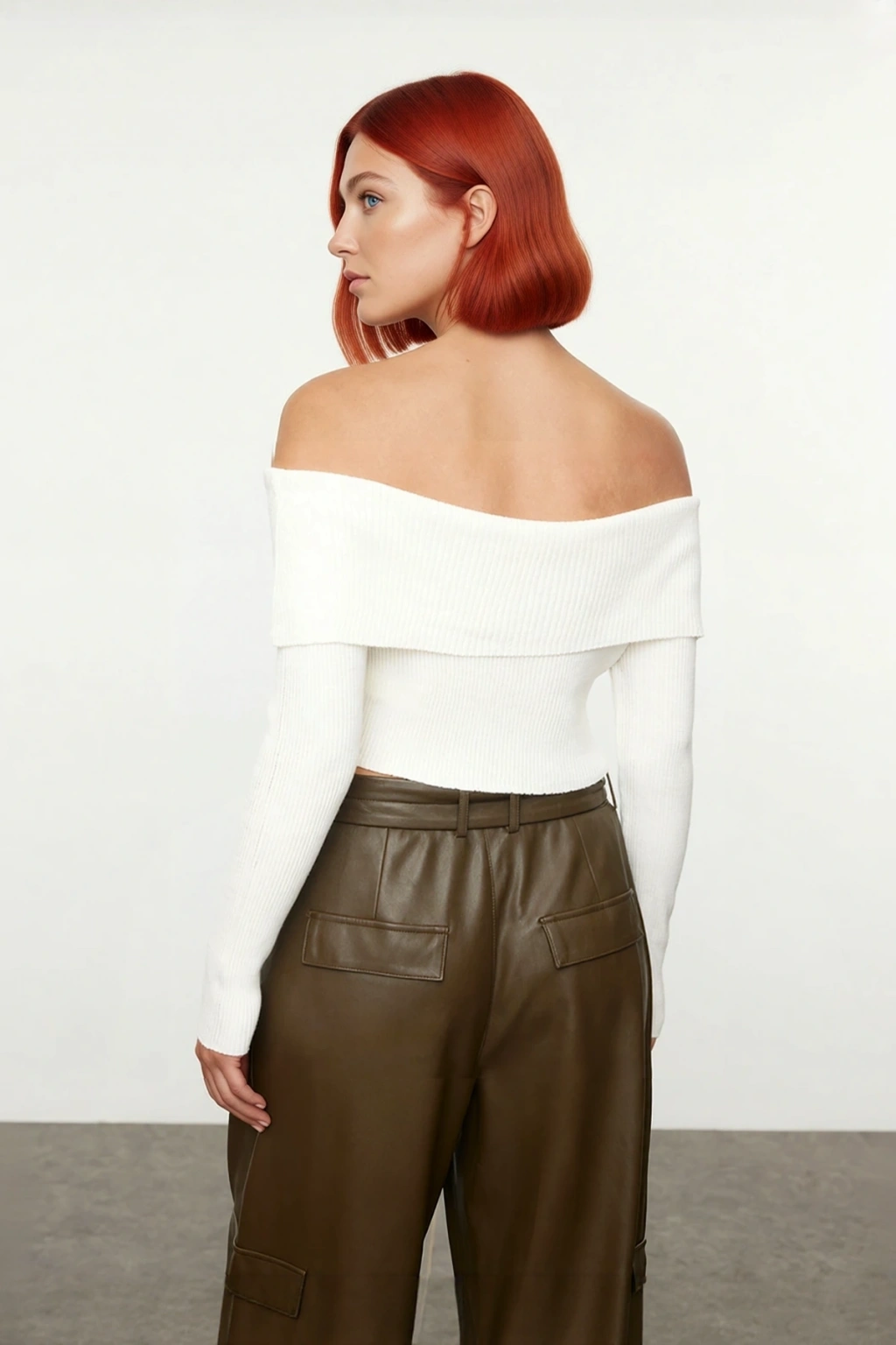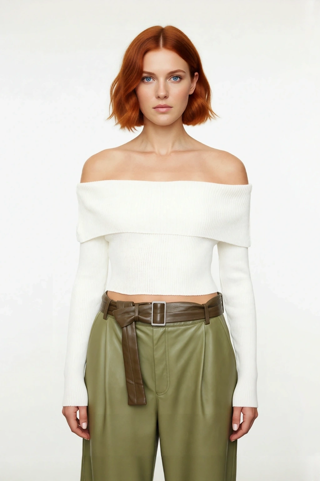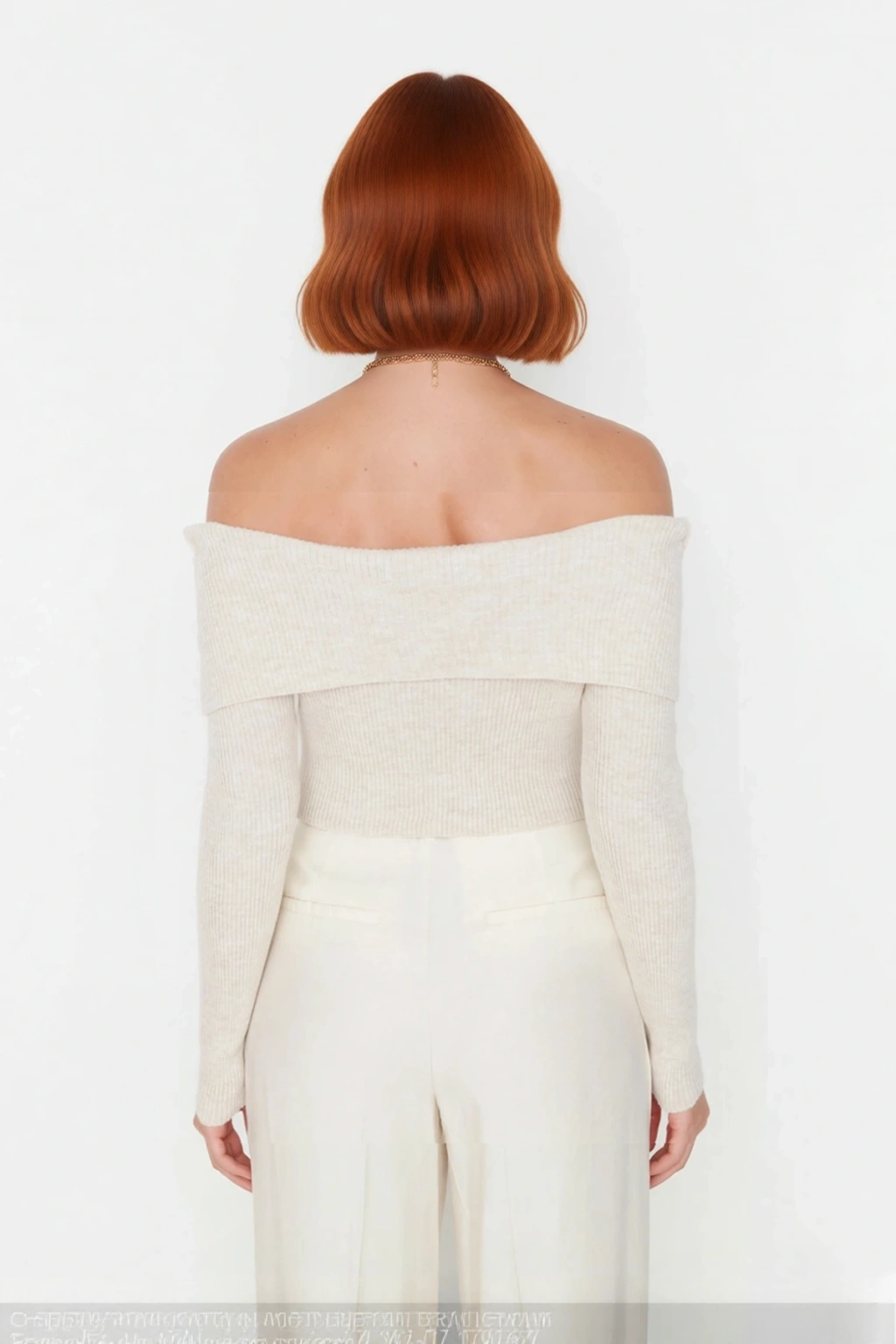 Ürün Özellikleri: Fitted kalıp, akrilik materyal, düz desen, carmen yaka, standart kol, triko kumaş, ekru renk, baskısız tasarım, crop boy.