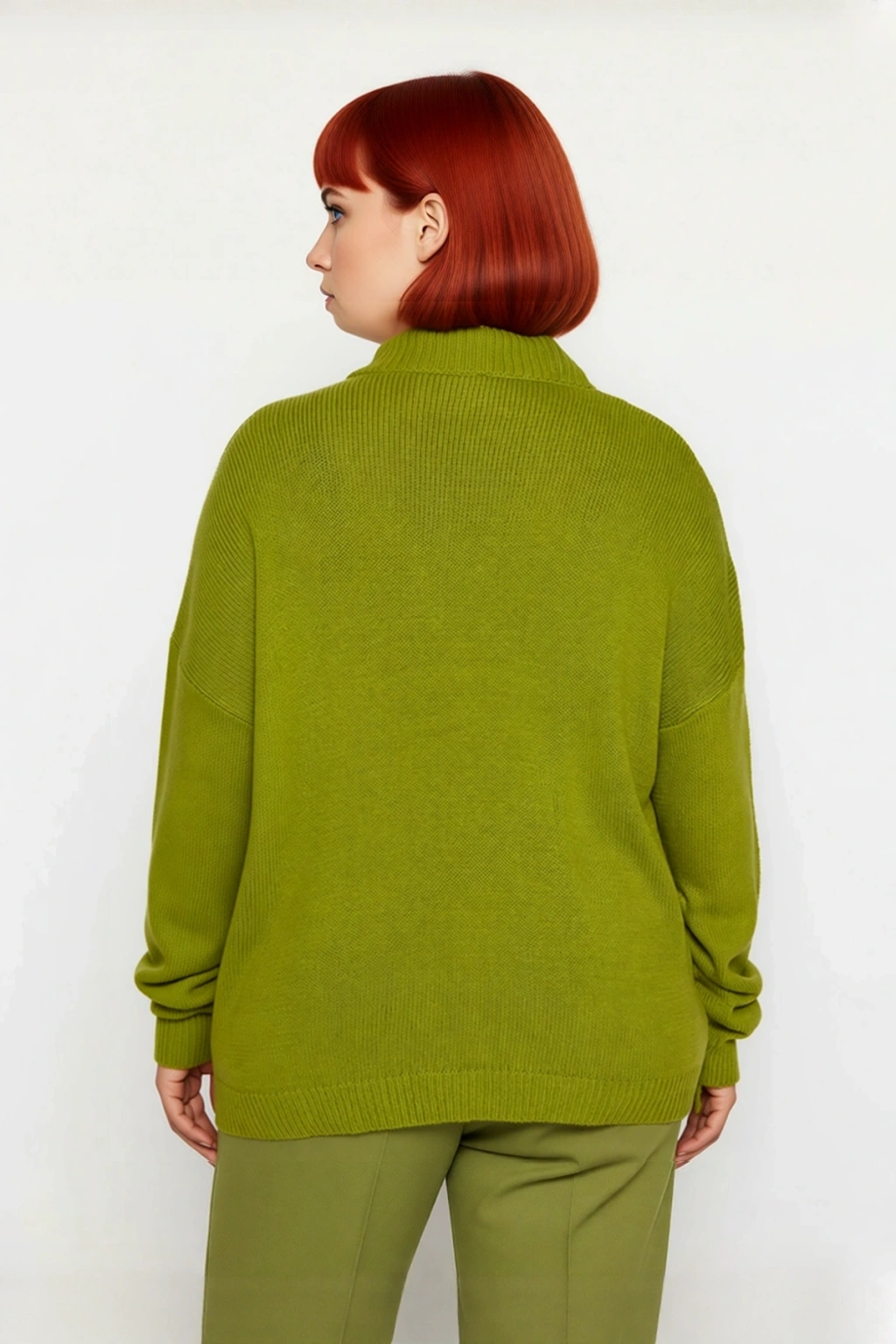 Ürün Özellikleri: Regular kalıp, akrilik materyal, düz desen, V yaka, büzgülü kol, triko kumaş, yeşil renk, baskısız tasarım.