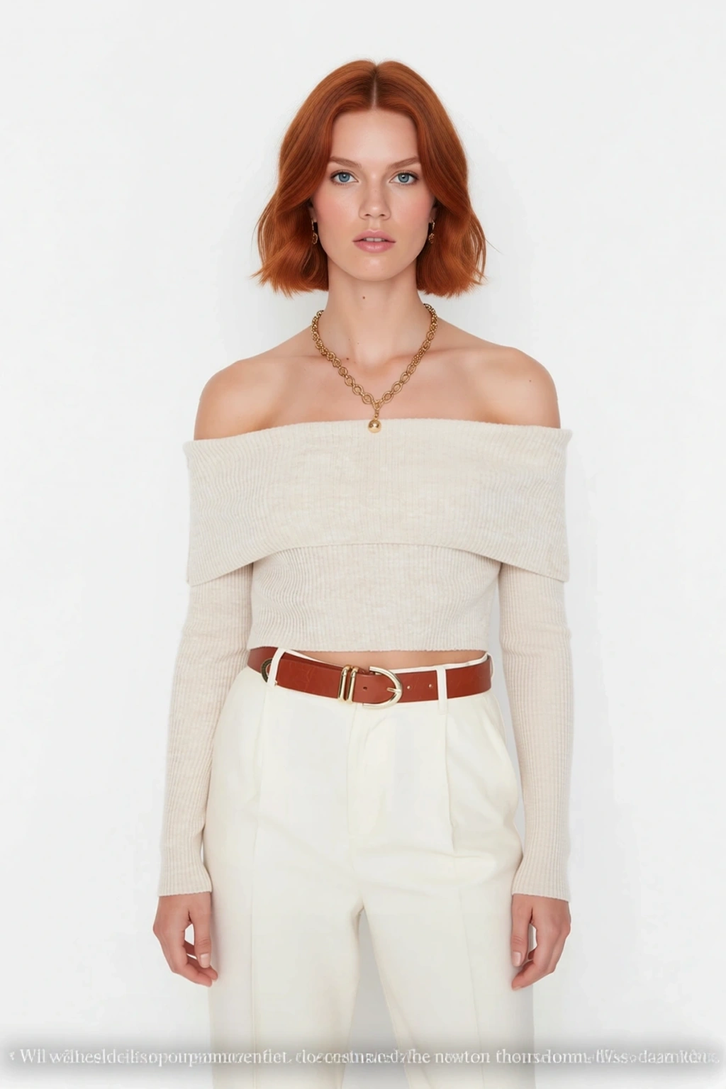 Ürün Özellikleri: Fitted kalıp, akrilik materyal, düz desen, carmen yaka, standart kol, triko kumaş, ekru renk, baskısız tasarım, crop boy.