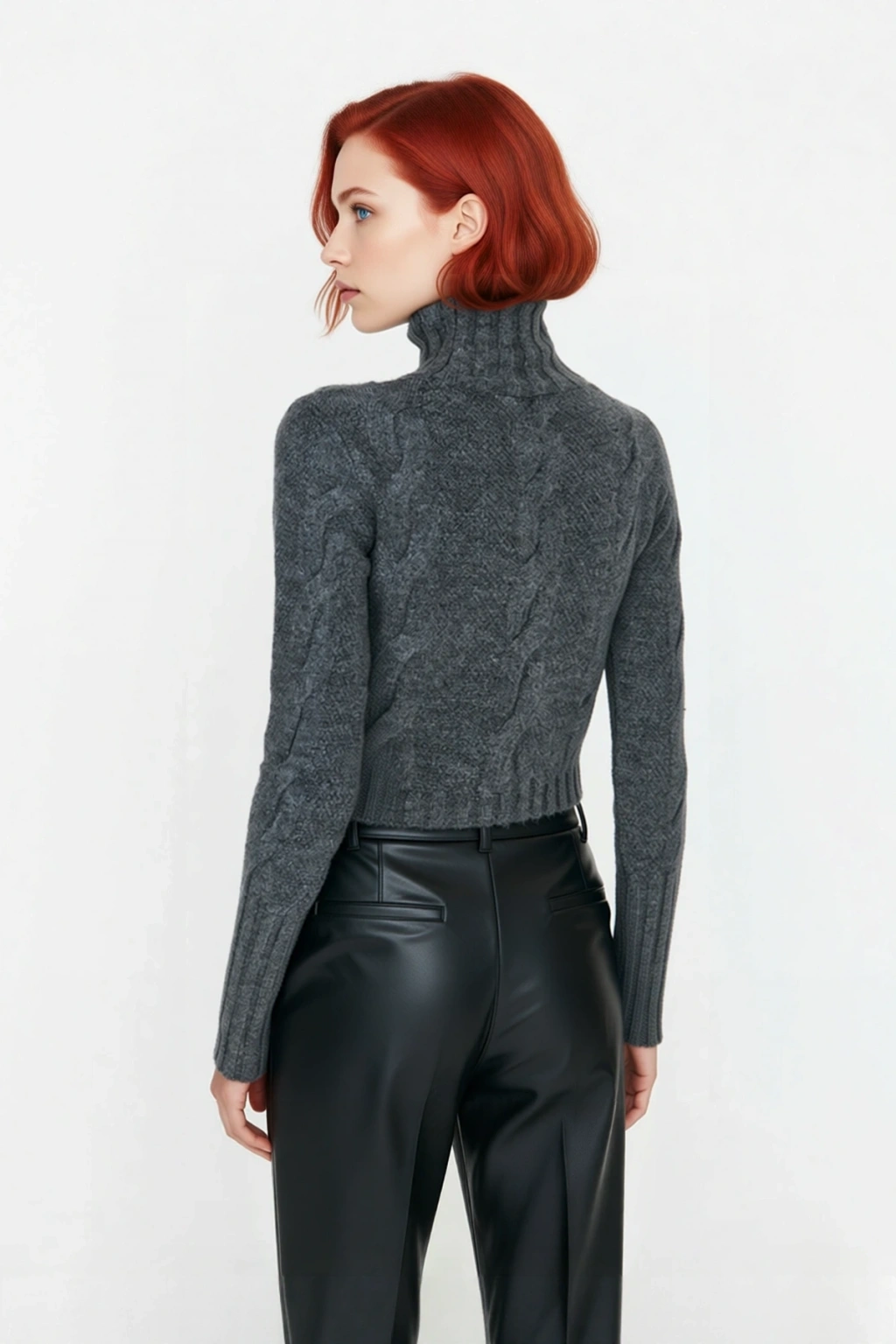 Ürün Özellikleri: Regular kalıp, akrilik materyal, saç örgü desen, dik yaka, standart kol, triko kumaş, gri renk, cepsiz tasarım.
