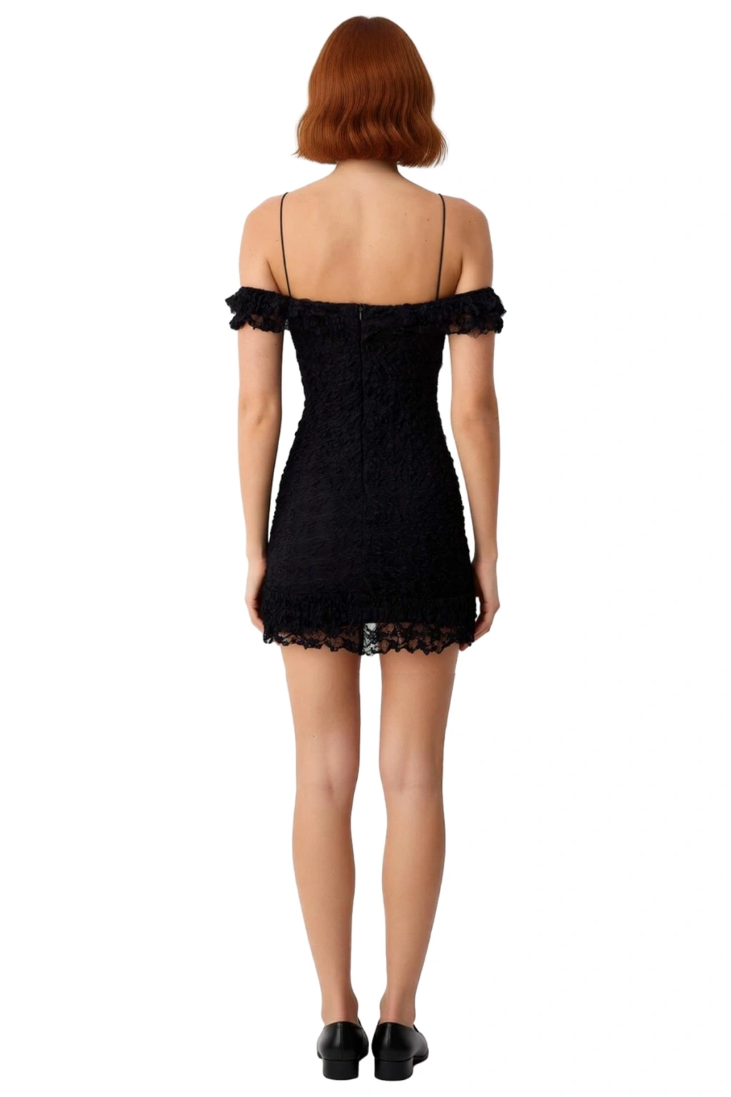 Kadınların özel anları için tasarlanmış bu bodycon elbise, vücuda kusursuzca oturan kalıbıyla feminen hatları ön plana çıkarır. Şık ve göz alıcı dantel dokuma tipi, zarafet ve çekiciliği bir araya getirirken, %100 polyester materyali hafif ve rahat bir giyim deneyimi sunar. Klasik siyah rengi her türlü aksesuarla kolayca kombinlenebilir ve her zaman şık bir tercih olmaya devam eder. Düz deseni ile dantelin asil dokusunu öne çıkaran bu tasarım, modern kadının gardırobunda olması gereken bir parçadır.