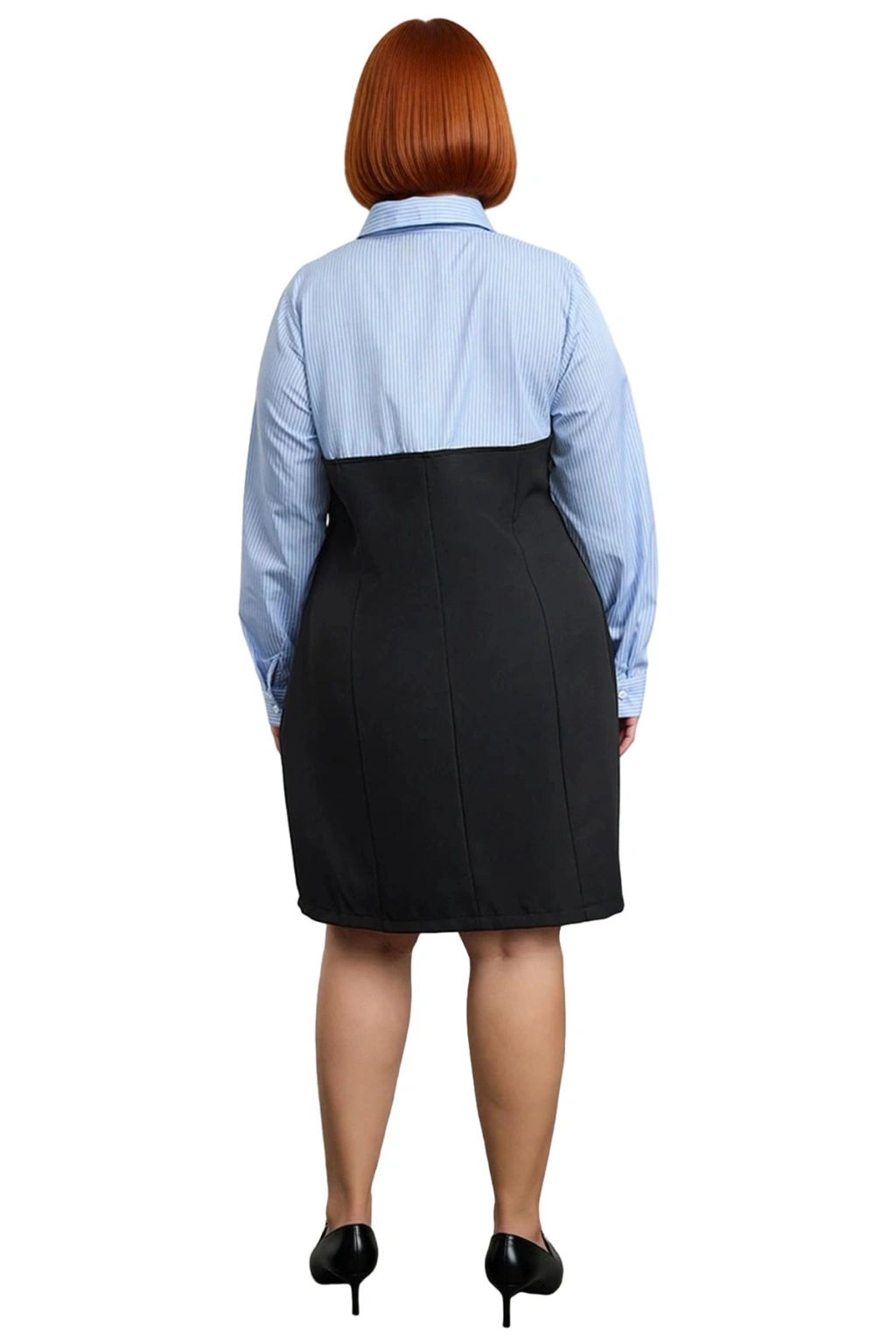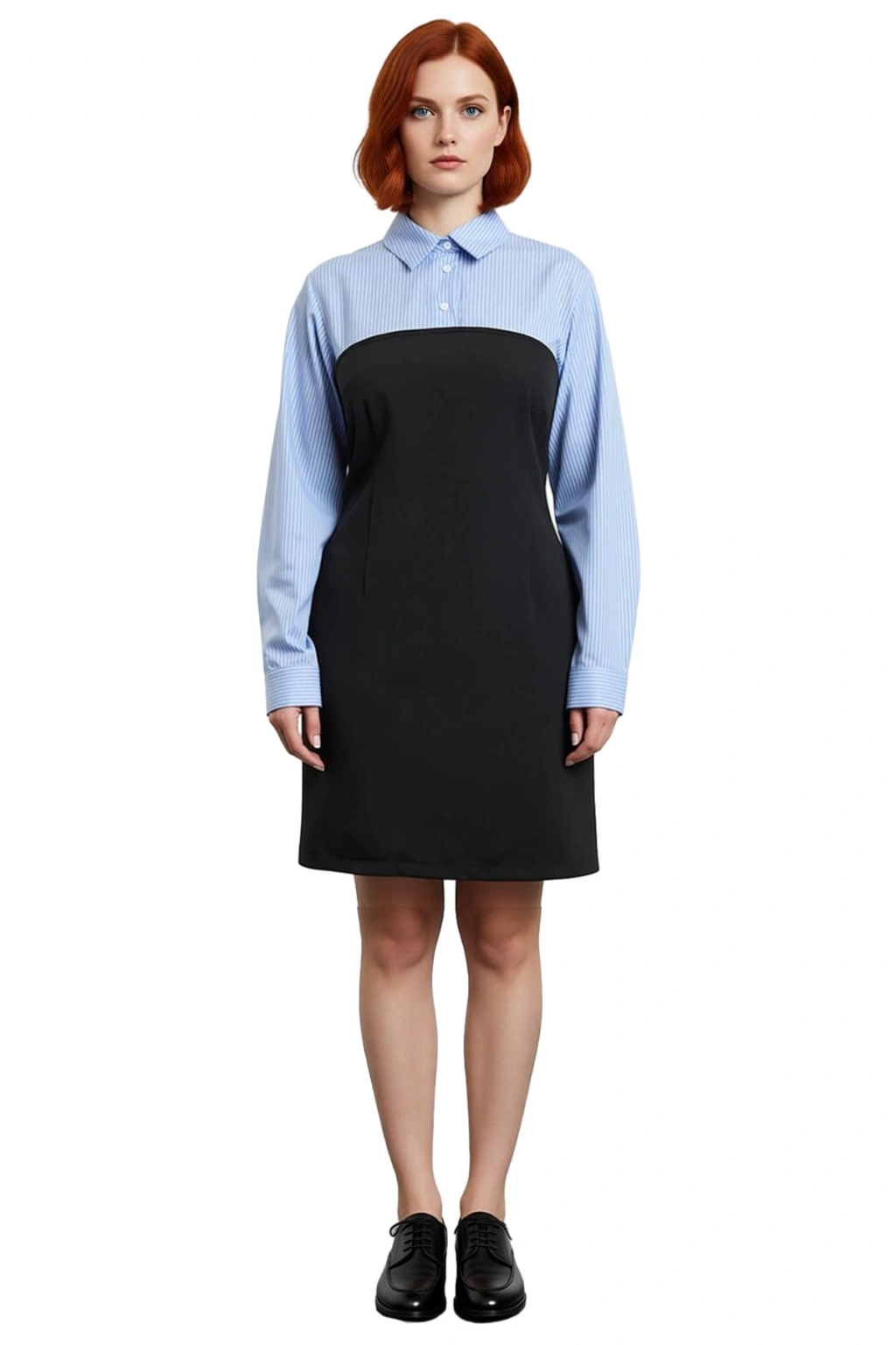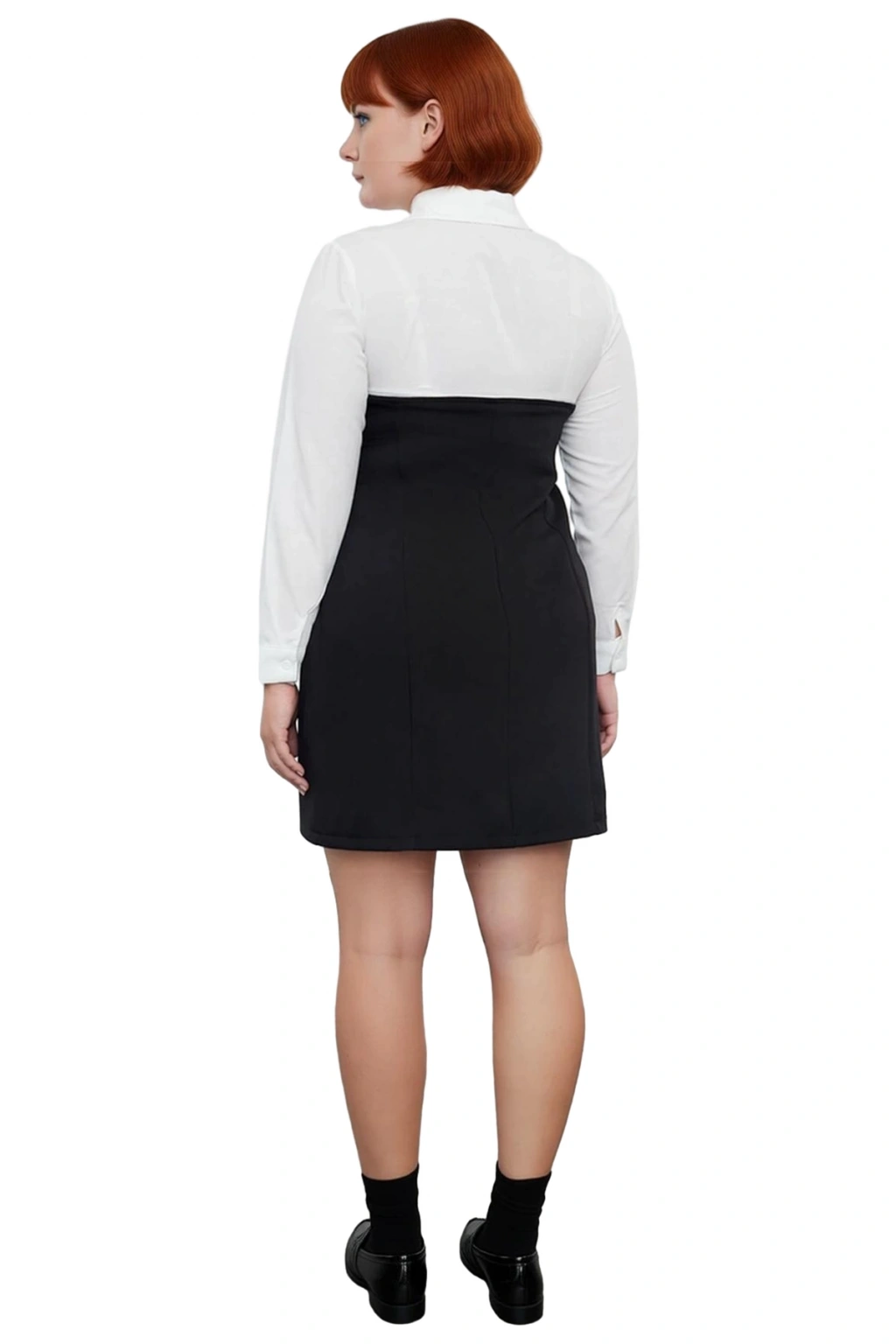 Ürün Özellikleri: Bodycon kalıp, polyester elastan materyal, renk bloklu desen, gömlek yaka, uzun kol, dokuma kumaş, siyah beyaz renk, astarsız tasarım.