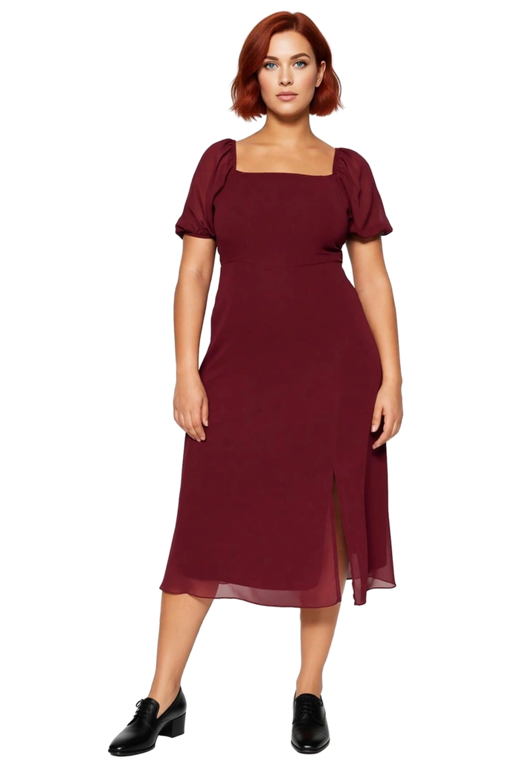 Ürün Özellikleri: A-line kalıp, 100% polyester materyal, düz desen, kare yaka, balon kol, şifon kumaş, bordo renk, astarlı tasarım.