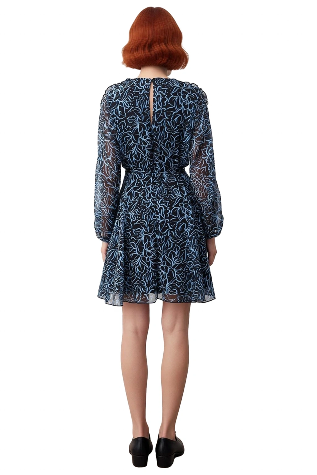 Ürün Özellikleri: Skater kalıp, 100% polyester, çiçekli desen, bisiklet yaka, standart kol, şifon kumaş, mavi renk, fırfırlı detay, kısa boy.