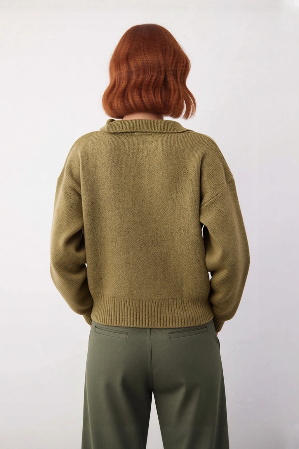 Ürün Özellikleri: Oversize kalıp, %69 akrilik %31 polyester materyal, düz desen, polo yaka, düşük kol, triko kumaş, haki renk, orta kalınlık, regular boy.