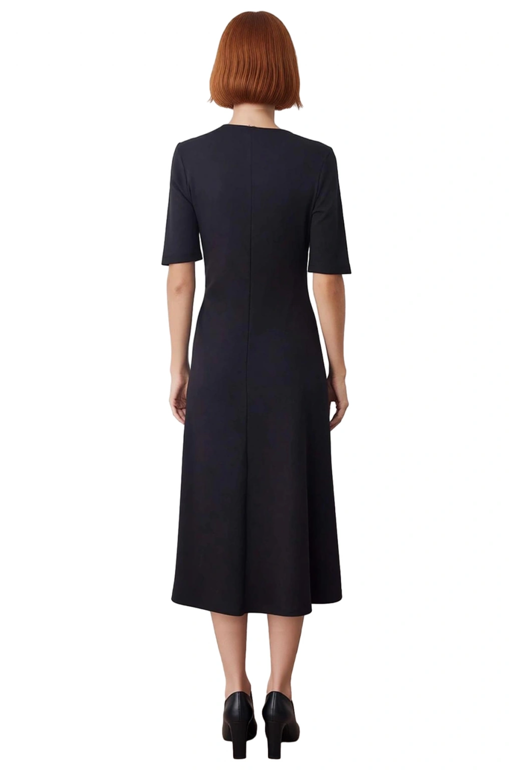 Bisiklet yaka tasarımı, hem klasik hem de çağdaş bir görünüm sağlayarak kullanım çeşitliliğini artırır. Standart kısa kolları, hareket özgürlüğünü kısıtlamadan rahat bir kullanım sunar ve mevsim geçişleri için idealdir. Örme kumaş dokusu, interlok dokuma tekniğiyle birleşerek elbiseye dayanıklı ve tok bir yapı kazandırır. Bu sayede elbise, uzun süreli kullanımlarda bile formunu ve kalitesini korur. Astarsız yapısı sayesinde hafif ve ferah bir his verirken, midi boyu ile modern ve şık bir duruş sergiler. Bakım kolaylığı sağlayan makinede yıkanabilir özelliği, pratikliğiyle öne çıkar.