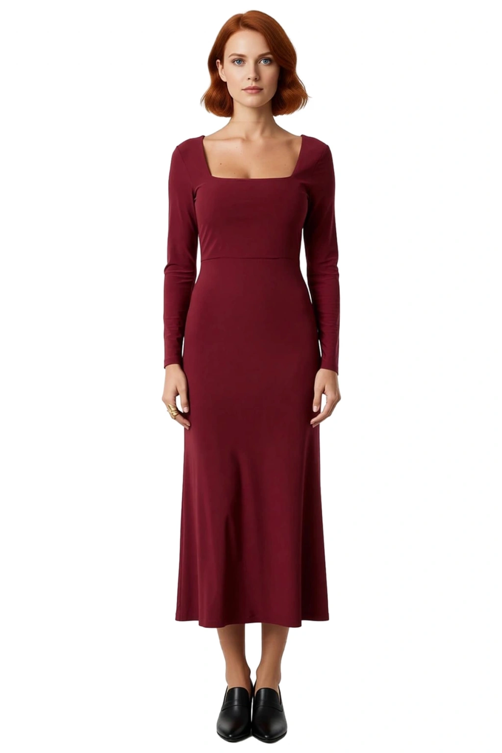 Ürün Özellikleri: Bodycon kalıp, polyester karışımlı materyal, düz desen, kare yaka, standart uzun kol, örme kumaş, bordo renk, baskısız tasarım.