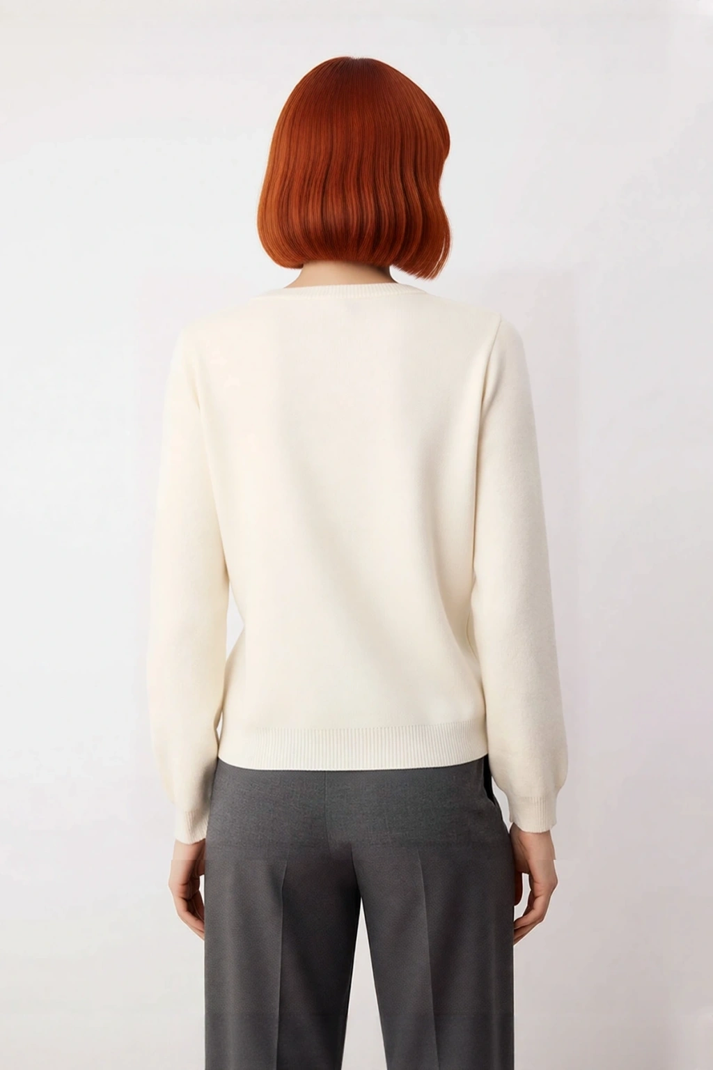 Ürün Özellikleri: Regular kalıp, akrilik/polyester/viskoz materyal, düz desen (kalp taş detaylı), bisiklet yaka, standart kol, triko kumaş, ekru renk.
