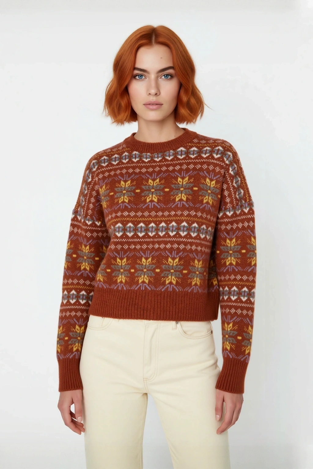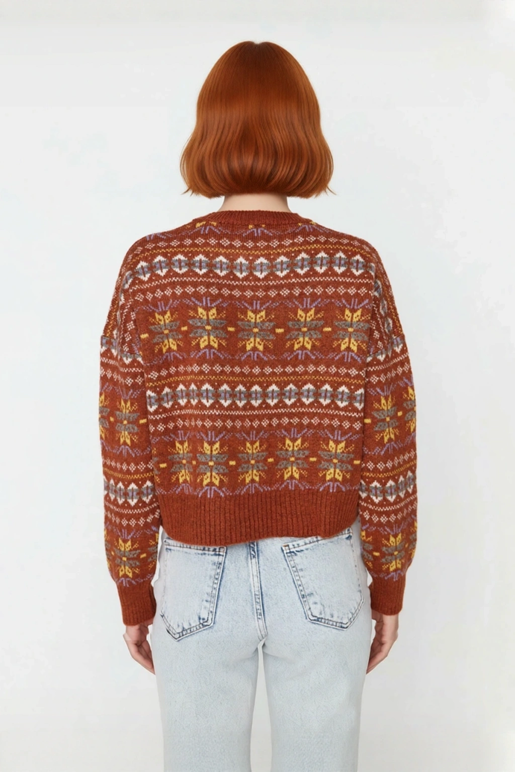 Ürün Özellikleri: Oversize kalıp, %79 akrilik %21 polyester materyal, etnik desen, bisiklet yaka, düşük kol, triko kumaş, kahverengi renk.